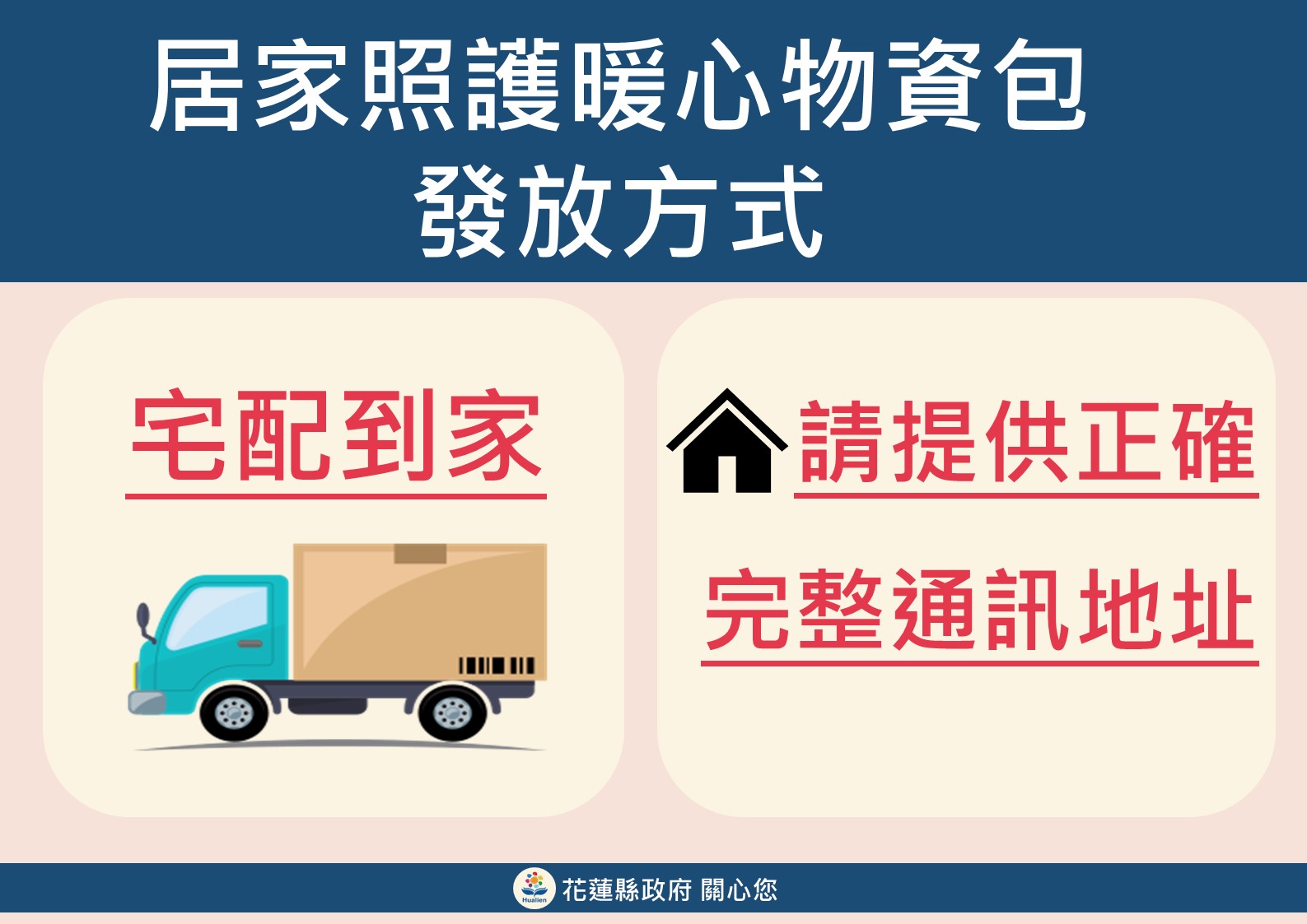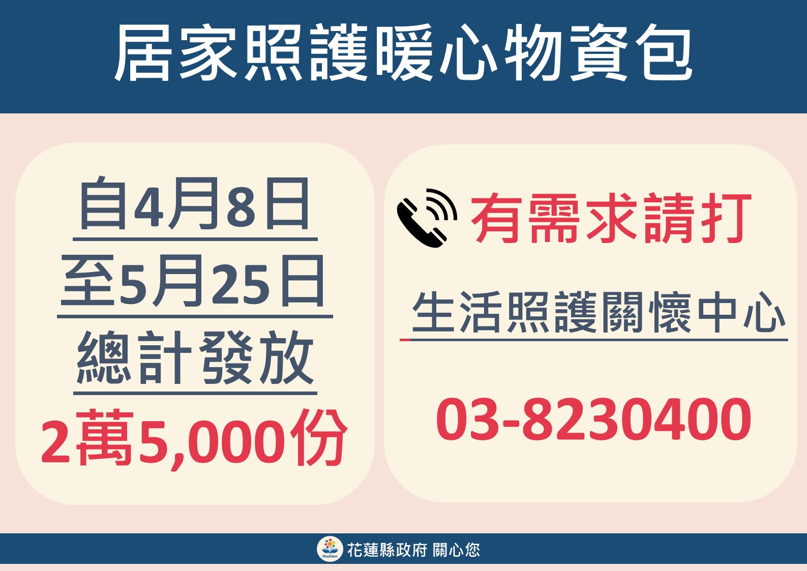 縣府自4月9日推出居家照護物資包,提供花蓮縣民眾居家照護期間補充的民生物資,隨著近期居家照護確診人數上升,從4月初每日約70包,至5月中每日物資包配送需求急遽增加至1,500包,累計至5月18日已發出1萬3,197包。隨著中央疫情指揮中心放寬隔離標準,居家照護物資包發放方式也因應調整。