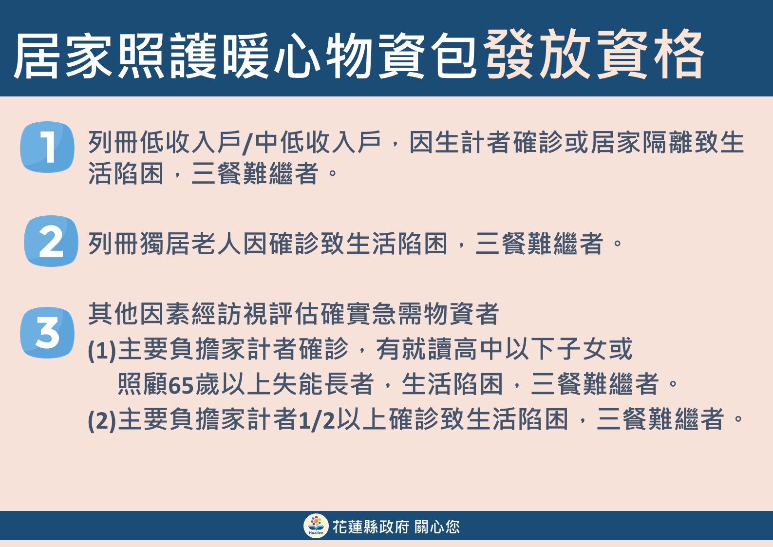 1. 列冊低收入戶/中低收入戶,因生計者確診或居家隔離致生活陷困,三餐難繼者。