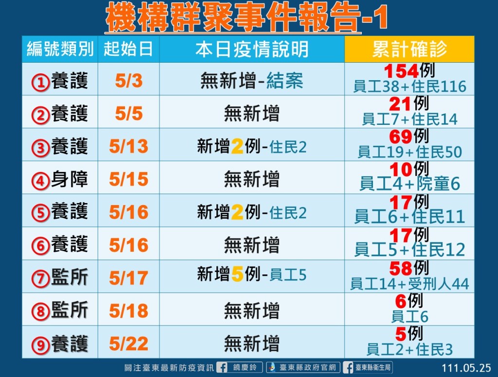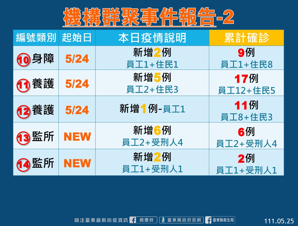 台東縣衛生局針對縣內機構COVID-19群聚事件說明,共新增28例確診個案。今天也新增2監所群聚,有8人確診(住民5、員工3),原先2間則新增5員工確診。另外,縣內第一家發生群聚事件的養護機構經10日觀察期與定期篩檢皆無新增個案於今日結案,其餘7家養護機構今日則有10例新增確診(住民7、員工3)。