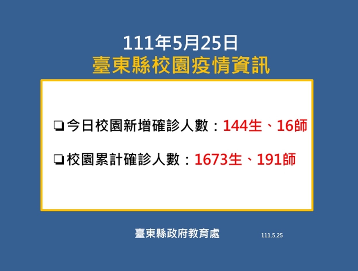 身障機構部分今日新增2人確診(住民1、員工1),為居家隔離期間陰轉陽,已完成視訊診療與投藥。另外,縣內2起醫院群聚事件,其中1家醫院持續檢出3人確診(1病人、2陪病),與先前確診者同病房具有地緣關係,已轉移至專責病房,另一間醫院則無新增個案。目前縣內仍有7養護、2身障、4矯正機關、2間醫院群聚事件監測中,衛生局持續定期採檢匡列中。在校園部疫情部分,台東縣今日則新增確診144生、16師,累計共1673生、191師。