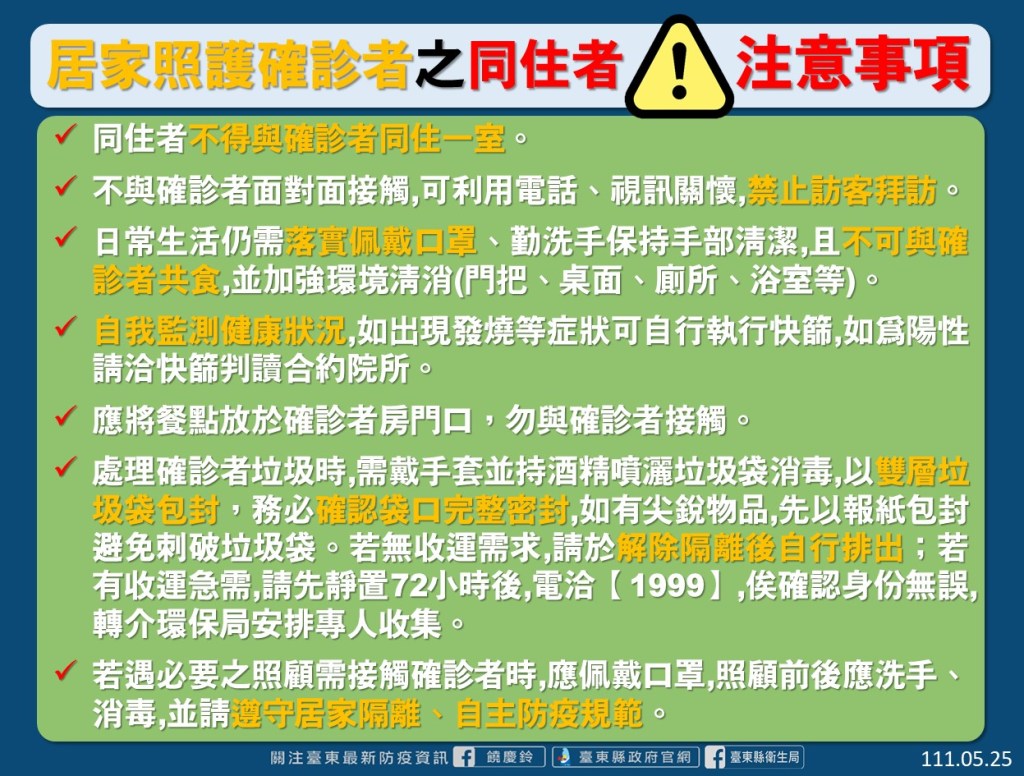 另外,因應中央確診判讀方式的改變,臺東縣政府TT守護包(防疫包)5/28日起將回歸實物銀行救助模式,改為主動針對縣內中低收老人、獨居中高風險及領有身心障礙生活補助、兒少脫貧、近貧戶等行動不便者發送TT惜福箱,不再針對居家照護者發放。