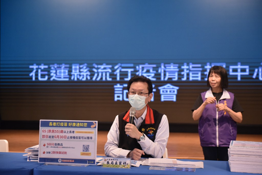 朱局長也說明兒童BNT疫苗校園集中施打期程,經醫療機構與學校端排定,提醒家長注意施打地點的最後報到時間。65(原民55)歲以上長者,即日起至6月30日止接種疫苗可以獲得500元衛教品(第1、2劑花蓮縣加碼500元衛教品至5月31日止),並加贈2劑快篩試劑,有原民身分的鄉親務必攜帶戶口名簿,造成鄉親的不便請見諒。家用快篩陽性PCR採檢站設立至5月29日,前往檢測的鄉親請攜帶健保卡,以及用夾鏈袋裝好的陽性快篩試劑。