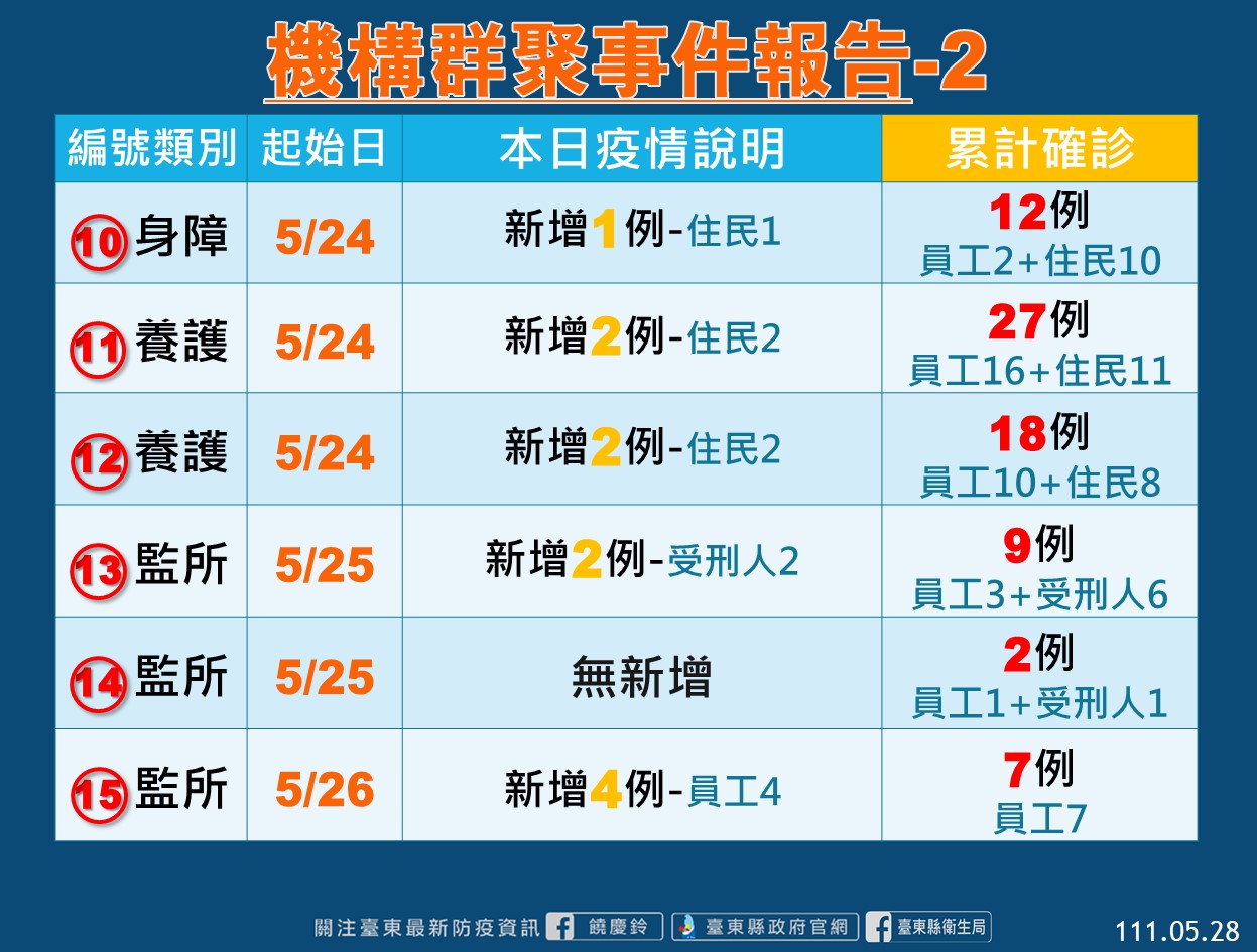 台東縣衛生局表示,目前縣內有7養護、2身障、5間監所、2醫院發生群聚事件,今日共計新增49確診個案。養護機構部分,新增28確診;身障機構新增1案,為群聚區域接觸者陰轉陽;監所部分新增19案,其中11人為工作人員,其餘8人為居家隔離中陰轉陽受刑人;醫院部分則新增1案為看護。衛生局仍持續定期採檢匡列,並協助機構落實感染管制措施。