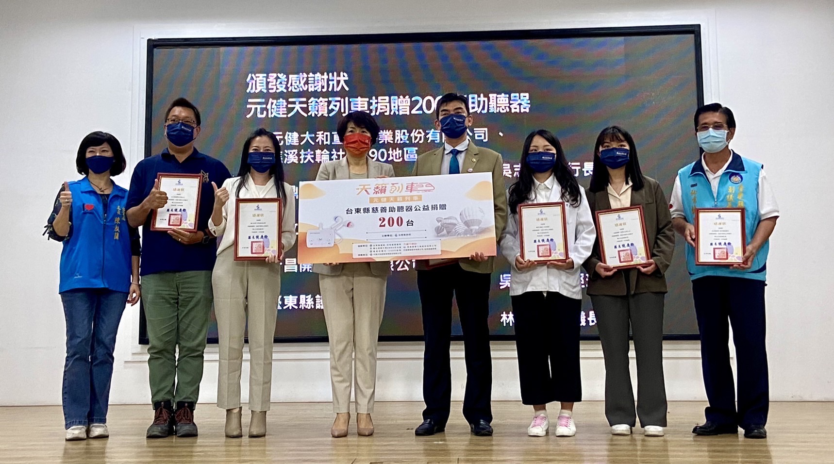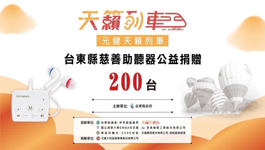 為使聽力障礙者重返有聲世界,臺東縣政府社會處結合元健天籟列車舉辦「慈善助聽器捐贈活動」,由「元健大和直販事業股份有限公司」捐贈200臺備有藍牙系統之耳寶助聽器(總計市值256萬元),讓聽障者配載後「從無聲變有聲」! 臺東縣政府特別於今(2)日擴大主管會報舉行表揚儀式,縣長饒慶鈴及臺東縣議會副議長林琮翰對元健大和直販事業股份有限公司捐贈助聽器表達感謝之意,同時,也對促成活動開辦的沂昌開發股份有限公司、眾鼎橡膠工業股份有限公司、礁溪扶輪社、國立清華大學EMBA校友會表達誠摯謝意。