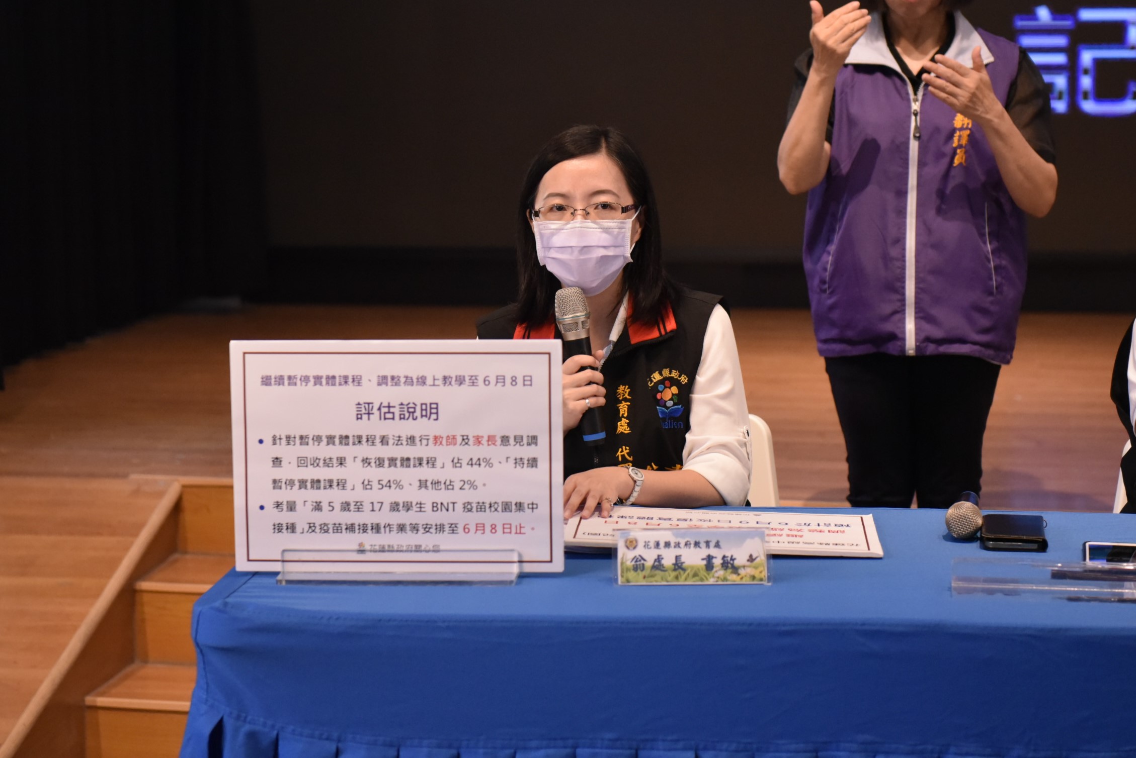 翁書敏也說明指出,花蓮縣高級中等以下學校(含公私立幼兒園)繼續暫停實體課程,調整為線上教學至6月8日,預計於6月9日恢復實體課程。繼續暫停實體課程,調整為線上教學至6月8日評估說明,針對暫停實體課程看法進行教師及家長意見調查,回收結果「恢復實體課程」佔44%,「持續暫停實體課程」佔54%,其他佔2%。另考量「滿5歲至17歲學生BNT疫苗校園集中接種」及疫苗接種作業等安排至6月8日止。