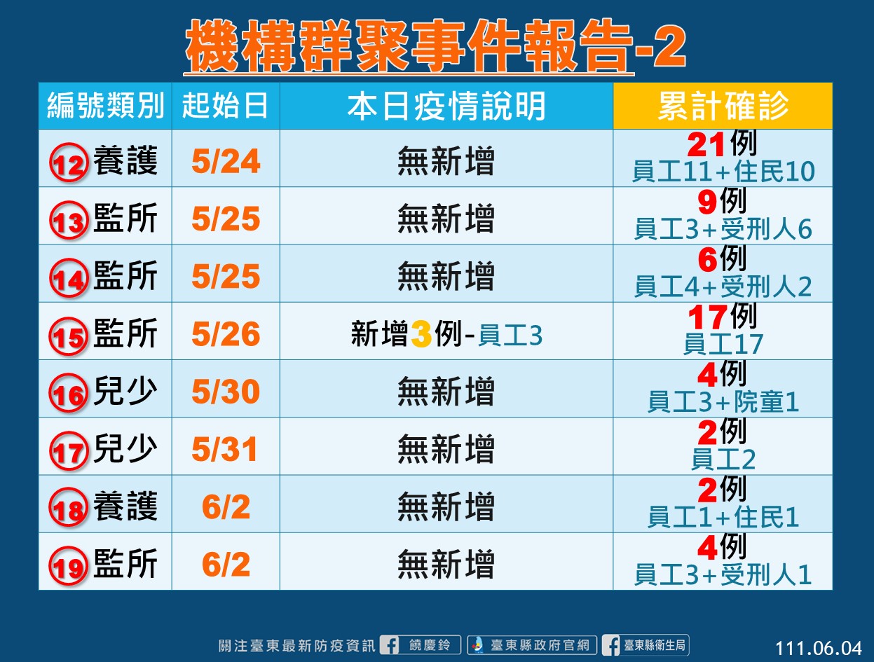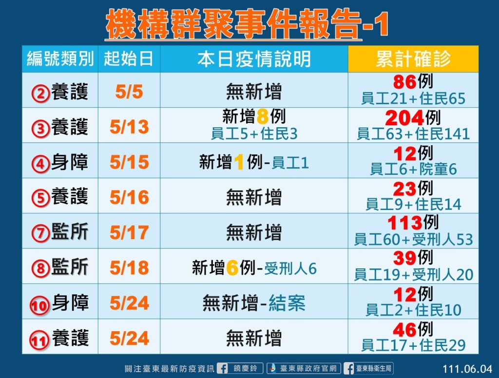 台東縣衛生局表示,今日縣內1身障機構監測期滿無新增個案列為結案。目前縣內仍有6養護、1身障、2兒少、6間監所、2醫院發生群聚事件,今日共新增18例確診個案。養護機構部分,新增8人確診(5員工、3住民);身障機構期滿採檢新增1員工陰轉陽;監所新增9例(3員工、6住民);醫院、兒少機構今日無新增。衛生局將持續安排定期採檢匡列,並協助機構落實感染管制措施。