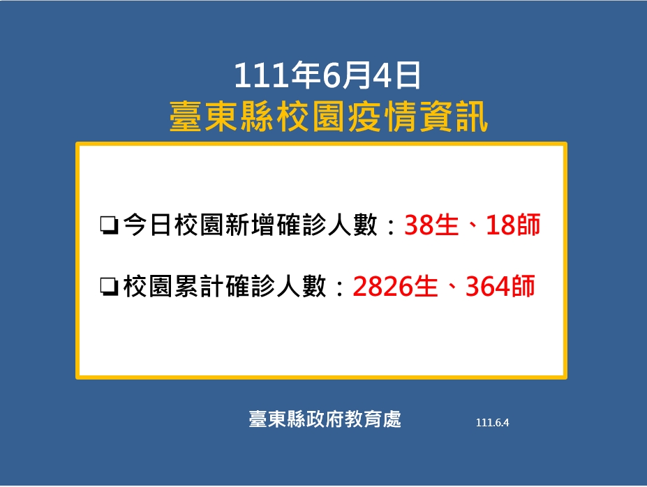 另外,中央今日也公布臺東1確診個案死亡病例,為49歲男性、無接種新冠疫苗紀錄,有慢性病史。在校園疫情部分,台東縣今日則新增確診38生、18師,累計共2826生、364師。