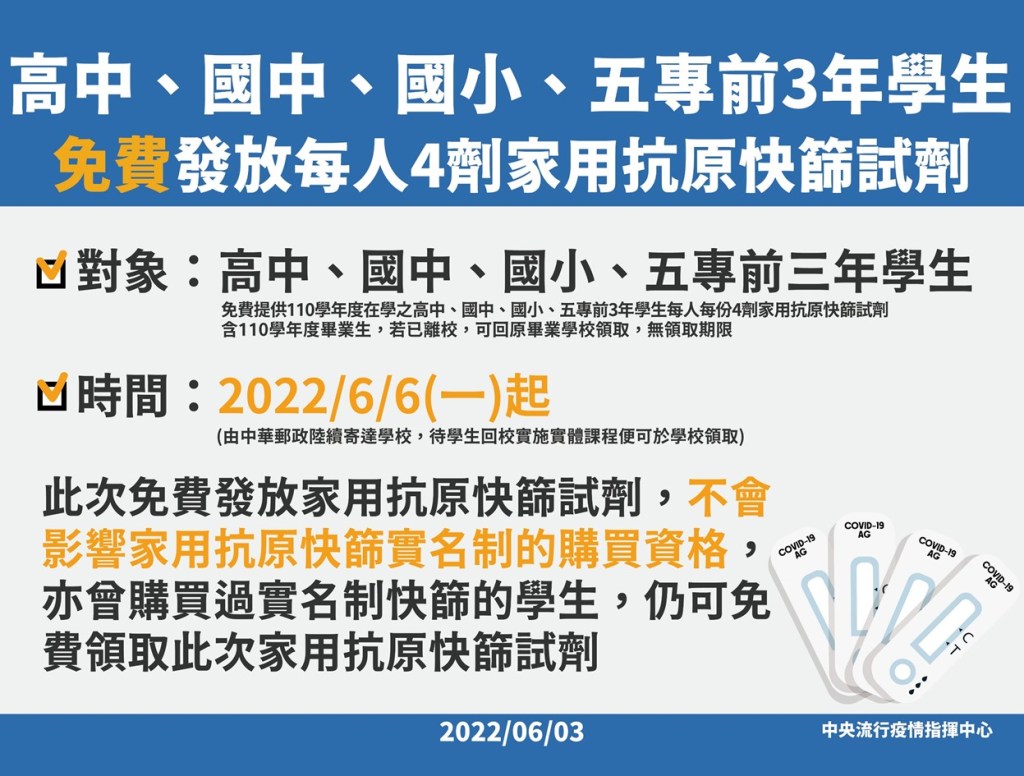 此外,為增加保護幼兒之範圍,幼兒免費領取5劑快篩試劑政策,自6月6日起,對象擴大為學齡前幼兒,請家長可持學齡前幼兒健保卡(104年9月2日(含)以後出生之孩童) ,至販售家用快篩試劑之實名制健保特約藥局及衛生所免費領取一份5劑家用快篩試劑,亦即曾經購買過實名制快篩的孩童,仍可再免費領取一次快篩試劑,領取期限至今年6月30日。請注意依孩子身分證尾數單、雙號分流。提醒幼兒家長,家用快篩僅可用於2歲以上幼童,幫2歲以下幼童領取的快篩試劑,可供幼童家長使用,勿使用於2歲以下幼童。