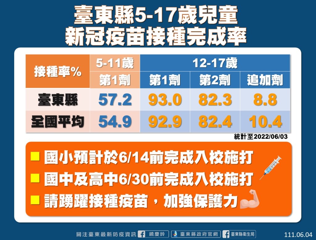 縣長饒慶鈴表示,為預防5-11歲未接種疫苗孩童因感染新冠病毒導致中重症情形,除要求各學校及衛生單位盡快完成入校接種疫苗作業,也已於6/1-6/2增設快打站接種,目前全縣5-11歲第一劑接種仍持續進行,截至6/3完成率為57.2%,高於全國54.9%。而國高中新冠疫苗加強劑入校施打也已經開始進行,預計這個月底前完成接種。