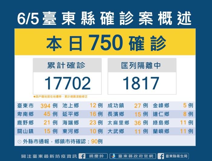 記者 姜嘉瑋/臺東報導 台東縣今(5)日新增750名確診者,660名民眾戶籍或居住地分在台東、90名為外縣市醫 … 繼續閱讀 台東今日新增750 饒慶鈴呼籲高齡者儘速接種疫苗 降低重症死亡風險