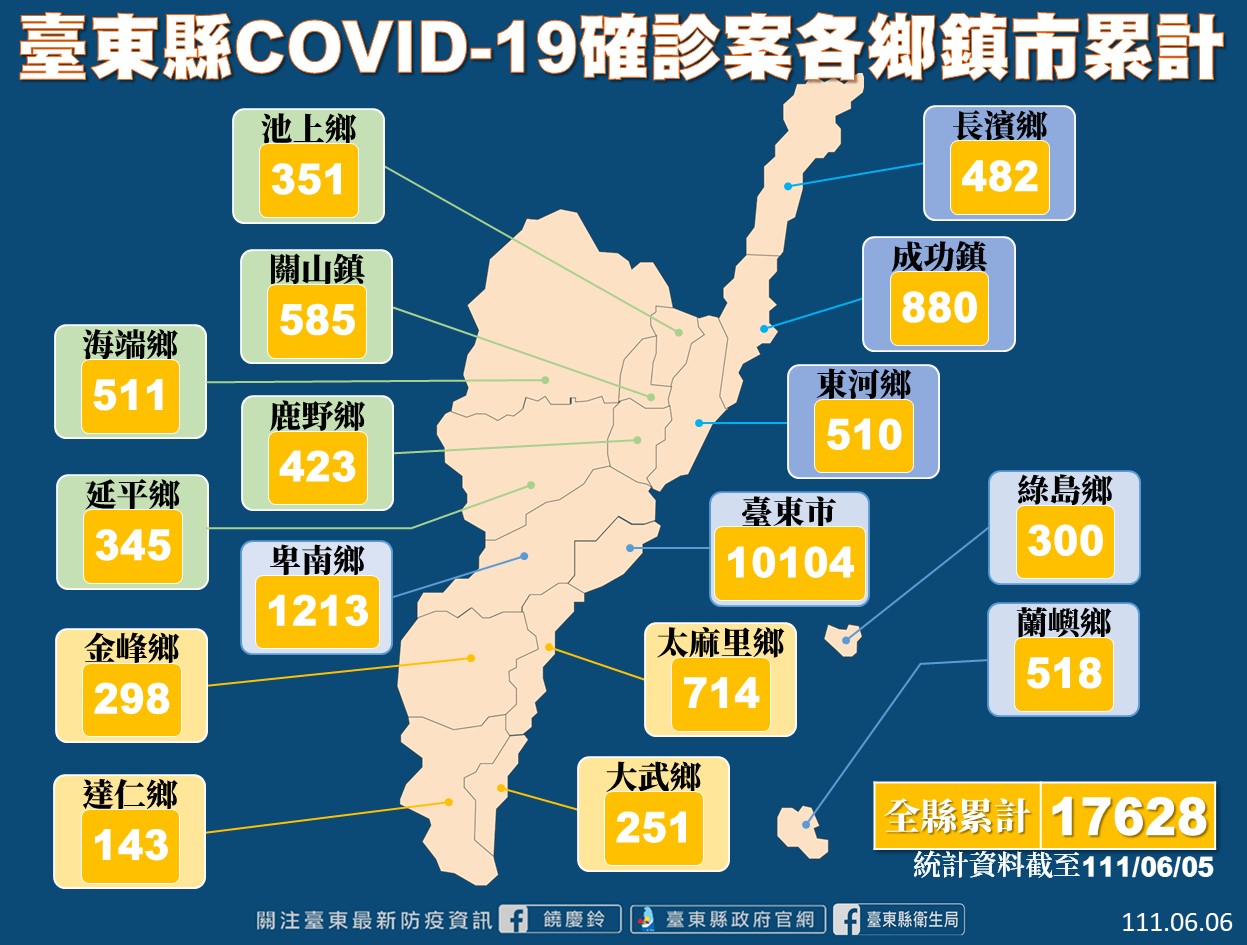 台東縣今(6)日新增550名確診者,483名民眾戶籍或居住地分在台東、67名為外縣市醫院通報。目前台東縣累計確診個案18178人、居隔者1709人。目前台東針對Covid-19確診者分流收治情況,截至6/5下午16點為止,住院收治人數為74人、加強版集中檢疫所為38人、居家照護現管人數有3966人。