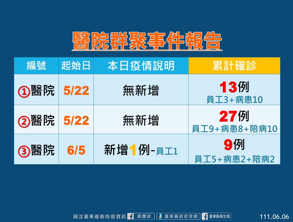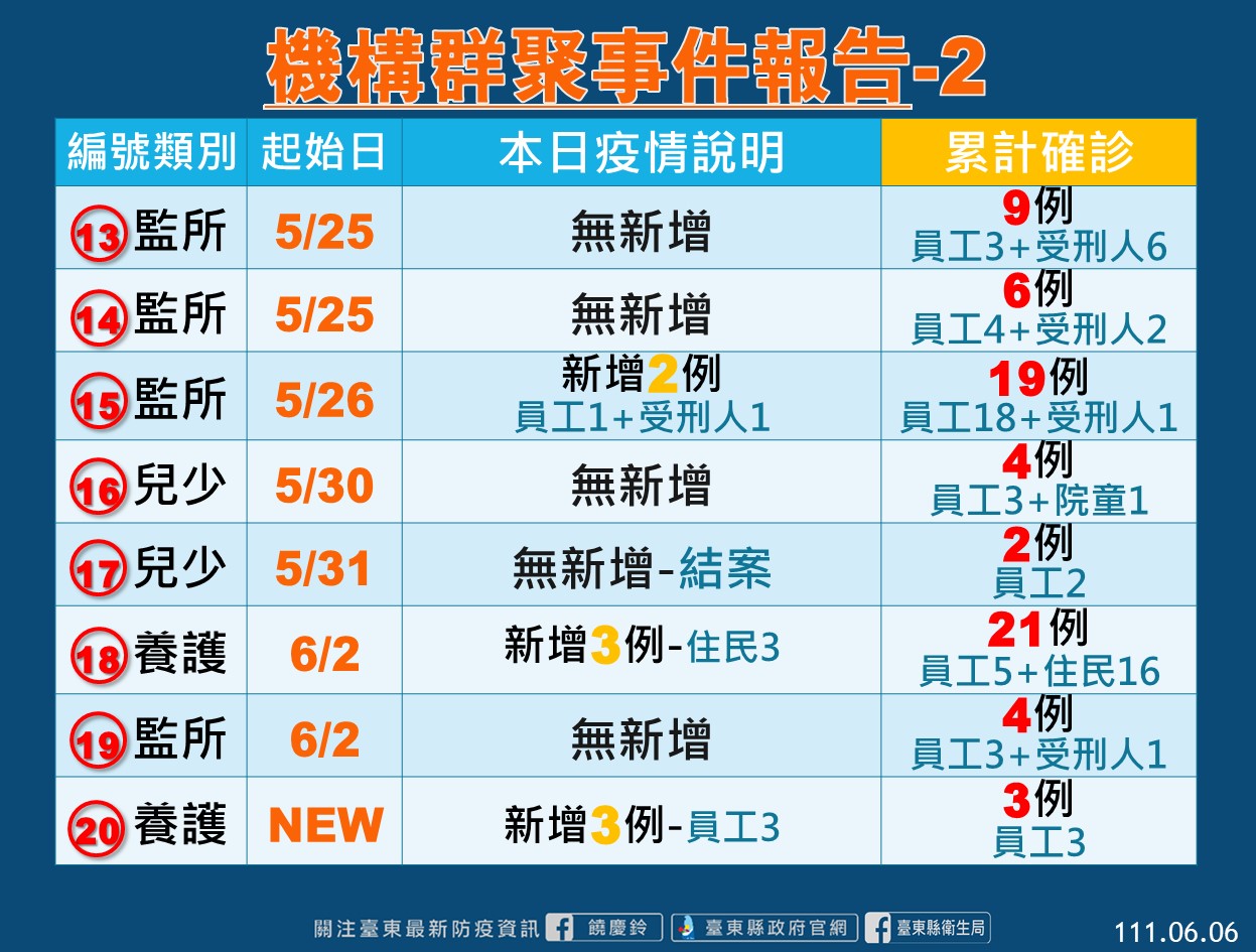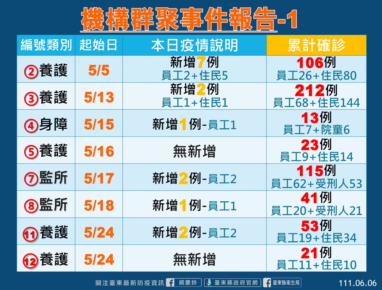 台東縣衛生局表示縣內機構群聚案部分,今日再新增1養護機構有3工作人員確診,而原有的6機構則新增14人確診(5員工、9住民);監所新增5人(4員工、1收容人);身障新增1員工確診;醫院部分新增1員工確診。另外,今日1兒少機構監測期滿無新增個案列為結案。目前縣內仍有7養護、1身障、1兒少、6間監所、3醫院群聚事件管理中。衛生局也持續安排定期採檢匡列,並協助機構落實感染管制措施