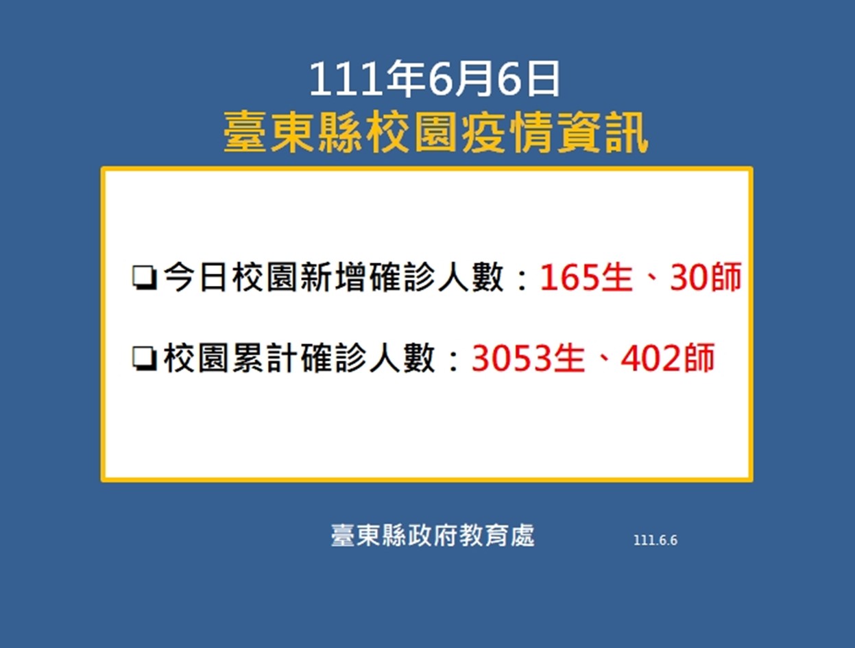 另外,中央今日也公布台東2例本土病例確診死亡個案,第一案為98歲女性,無接種疫苗紀錄,有中風病史;第二案42歲男性、無接種疫苗、有神經系統等疾病。在校園疫情部分,台東縣今日則新增確診165生、30師,累計共3053生、402師。