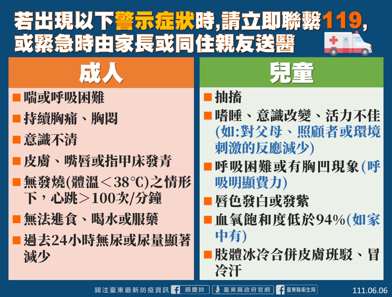 饒慶鈴縣長表示,Omicron病毒傳播速度非常快,請鄉親千萬不要掉以輕心,尤其是部分嬰幼兒確診後病程變化快,因此若孩子出現持續嗜睡、意識改變、活力不佳、抽搐、唇色發白或發紫等症狀,若家中成員或長者出現喘或呼吸困難、持續胸痛、胸悶、無發燒(體溫超過38度)之情形下,心跳每分鐘大100下,需緊急送醫,您可致電119請求協助,或緊急時由家長或同住親友自行開車送醫。