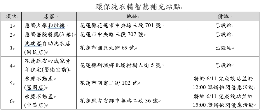 設置站點請查詢FB粉專「花蓮資源回收走透透」(https://www.facebook.com/HLEpb) 或「台塑生醫洗衣精智慧補充站地圖」(https://reurl.cc/E740RA)。