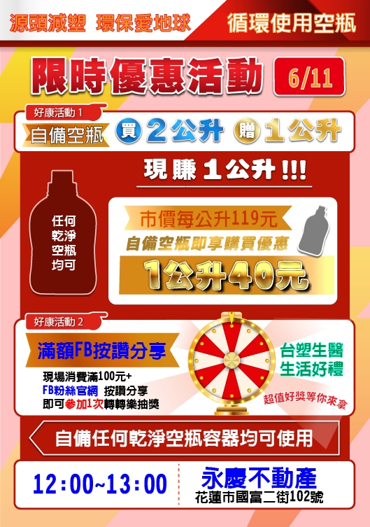 環保局將於6月11日在花蓮市國富二街102號(12:00~13:00)及花蓮縣吉安鄉中華路二段36號(15:00~16:00)新增補充站,並於當天舉辦快閃限時優惠活動,活動內容為買2公升送1公升(自備任何乾淨空瓶器均可使用),費用每公升40元,5元即可購買環保洗衣精,且消費滿100元即可參加1次轉轉樂抽獎活動,歡迎民眾支持自備容器購買環保洗衣精。
