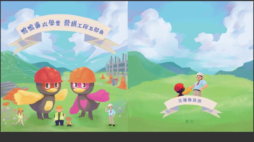 《鴨鴨廉政學堂-營繕工程五部曲》動畫與繪本,是花蓮縣政府首次針對國小高年級以上學子與從事工程採購業務人員製作的誠信教材,由縣府政風處依據專案稽核所發現之缺失態樣為素材編寫而成之故事教材,並與屏東大學視覺藝術學系團隊共同協力完成。