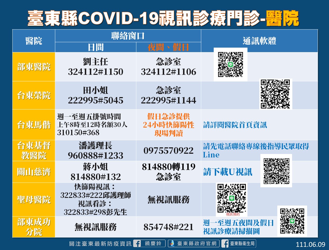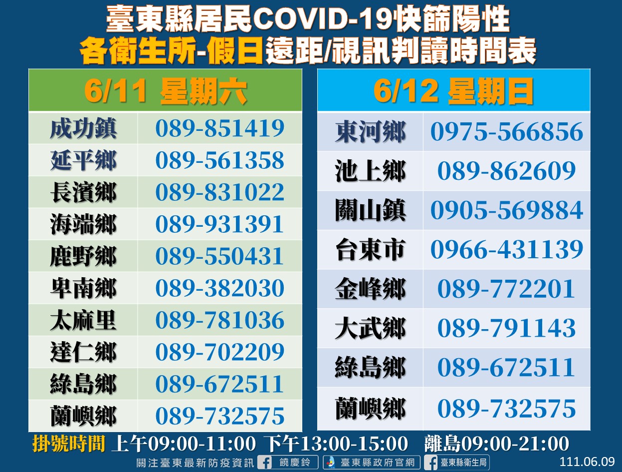 衛生局今日也於疫情說明會上說明,縣內Covid-19視訊診療門診有部分調整,馬偕醫院週一至週五掛號時間為上午八點至十二點,名額30人;而假日急診提供24小時快篩陽性現場判讀。另各地區衛生所針對快篩陽性民眾可提共假日遠距視訊判讀時間也有時間調整,但掛號時間皆仍為上午九點至十一點,下午一點到三點;離島地區則是上午九點至晚上九點未變動,提供鄉親假日服務,若有就醫需要,也可透過視訊看診或請親友代為領藥,相關訊息也請隨時注意台東衛生局粉絲專頁。