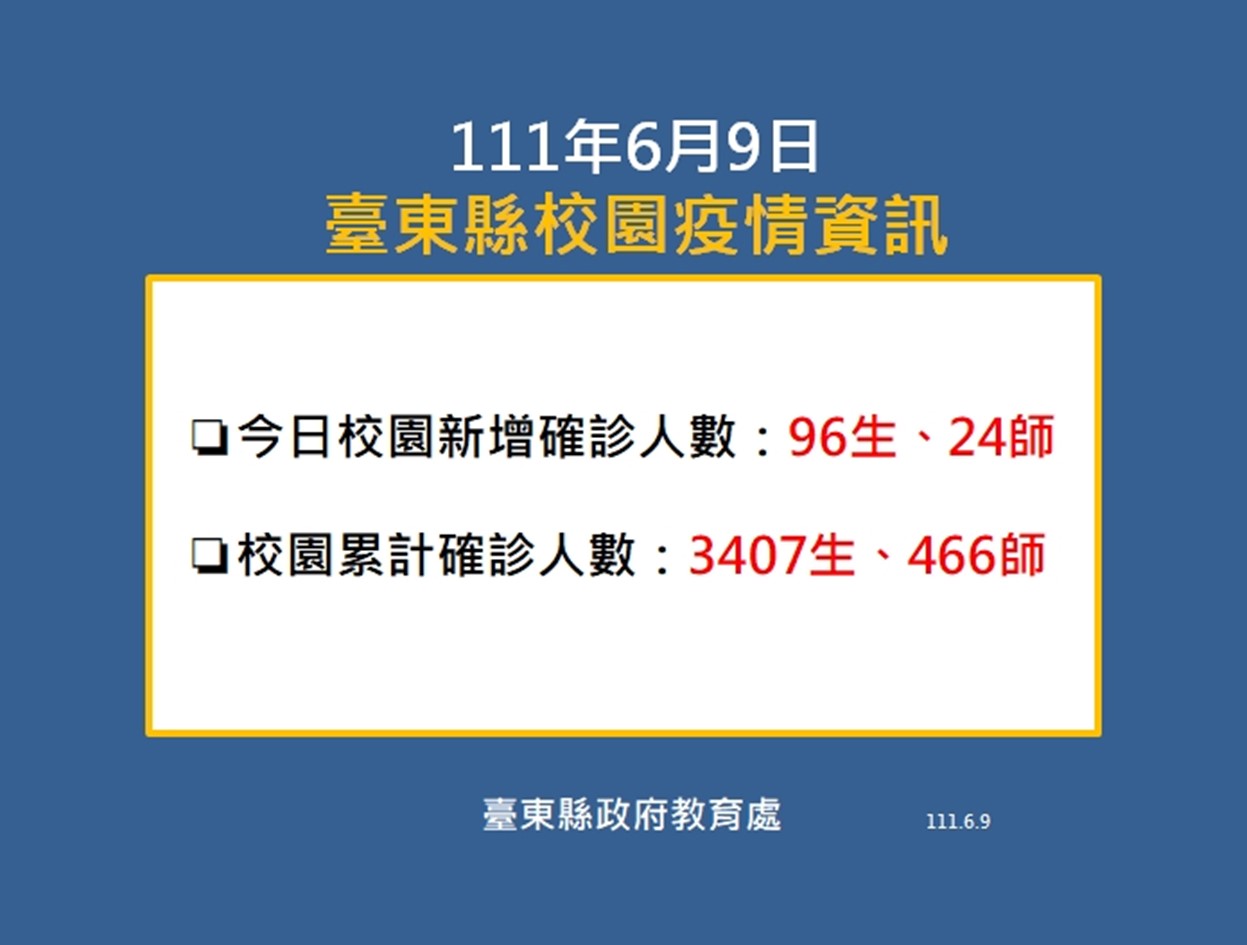另外,中央今日也公布台東2例本土病例確診死亡個案,第一案為93歲男性,已接種3劑疫苗、有服用抗病毒藥物,有肺部及慢性疾病史;第二案100歲女性,無接種疫苗、有服用抗病毒藥物、疾病史確認中。在校園疫情部分,台東縣今日則新增確診96生、24師,累計共3407生、466師。