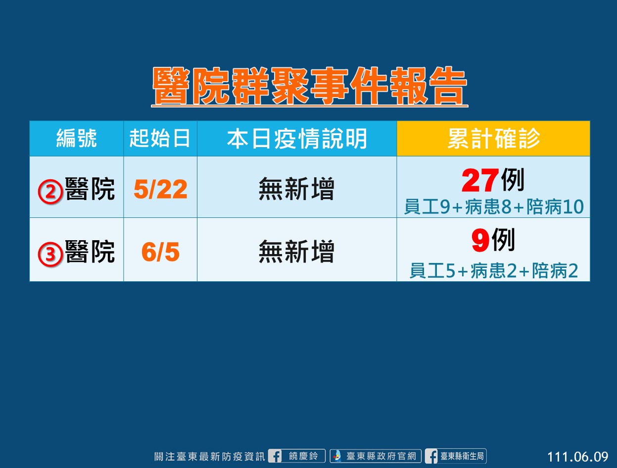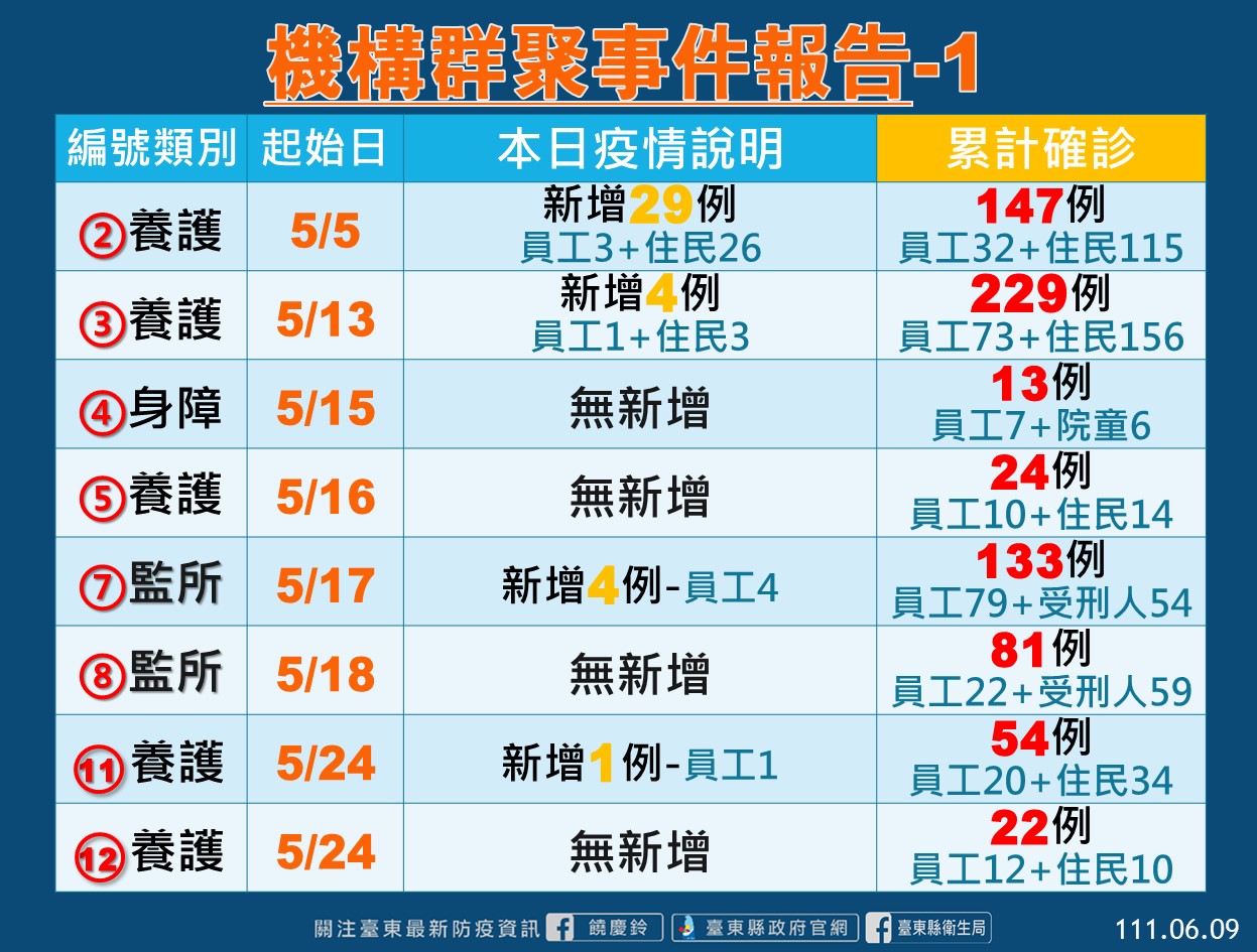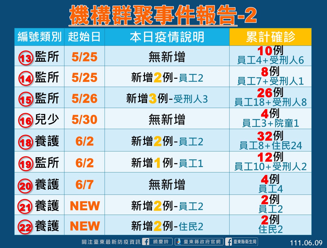 台東縣衛生局表示縣內機構群聚案部分,今日新增2養護機構群聚共4人確診(2住民、2員工),已完成全機構篩檢,其餘人員皆為陰性,原有的7養護機構則新增36人確診(7員工、29住民);監所新增10人(7員工、3收容人);身障、醫院、兒少機構部分今日無新增。目前縣內共有9養護、1身障、1兒少、6間監所、2醫院群聚事件管理中。衛生局也持續安排定期採檢匡列,並協助機構落實感染管制措施。