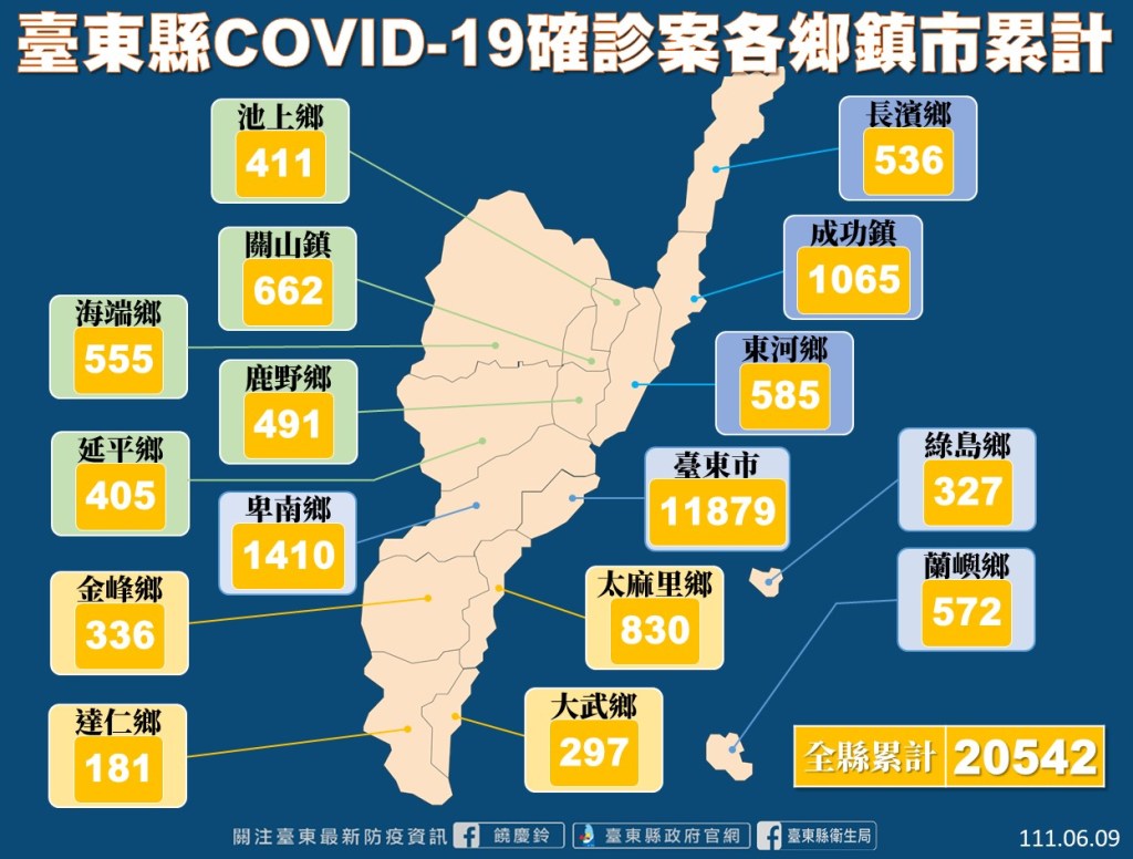 台東縣今(9)日新增792名確診者,673名民眾戶籍或居住地分在台東、119名為外縣市醫院通報。目前台東縣累計確診個案20542人、居隔者2071人。目前台東針對Covid-19確診者分流收治情況,截至6/8下午16點為止,住院收治人數為73人、加強版集中檢疫所為46人、居家照護現管人數有3811人。