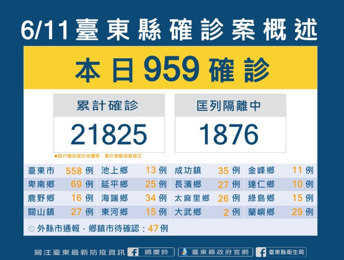 記者 姜嘉瑋/臺東報導 台東縣今(11)日新增959名確診者,912名民眾戶籍或居住地分在台東、47名為外縣市 … 繼續閱讀 台東今日新增959 縣府強調所發放富樂快篩劑與問題試劑批號不同 檢測正常請民眾安心使用