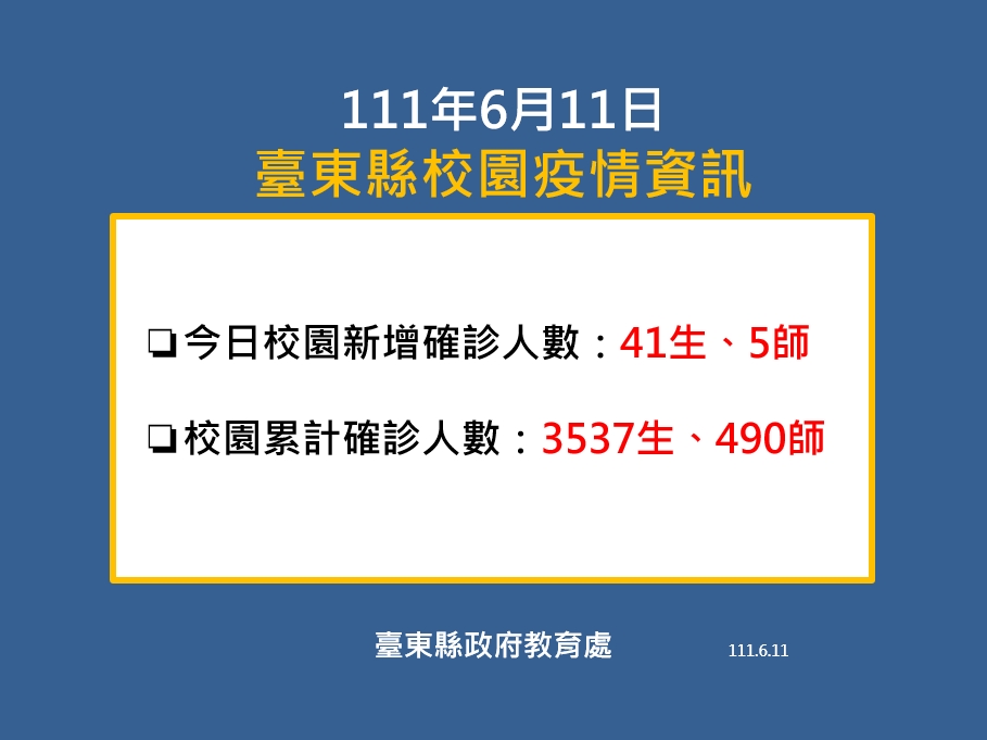 中央今日也公布台東3例本土病例確診死亡個案,第一案為94歲男性,無接種疫苗、多發性神經病變及慢性疾病;第二案90歲男性,無接種疫苗、失智及慢性疾病;第二案77歲男性,已接種3劑疫苗、慢性腎臟疾病、肝硬化及慢性疾病。在校園疫情部分,台東縣今日則新增確診41生、5師,累計共3537生、490師。