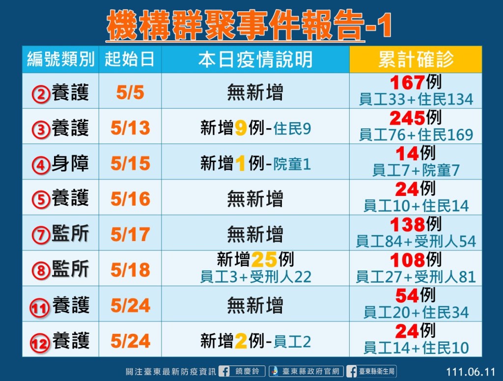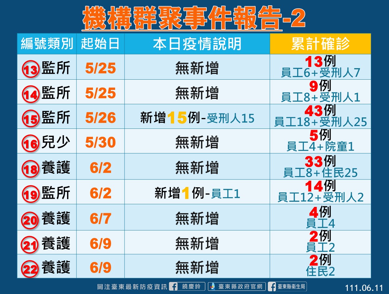 台東縣衛生局表示,目前縣內有9養護、1身障、1兒少、6監所、2醫院發生群聚事件,今日共新增53例確診個案。養護機構部分,新增11人確診 (2員工、9住民);監所部分新增41人(4員工、37住民);身障機構新增1住民確診;兒少、及醫院部分無新增。衛生局將持續安排定期採檢匡列,並協助機構落實感染管制措施。