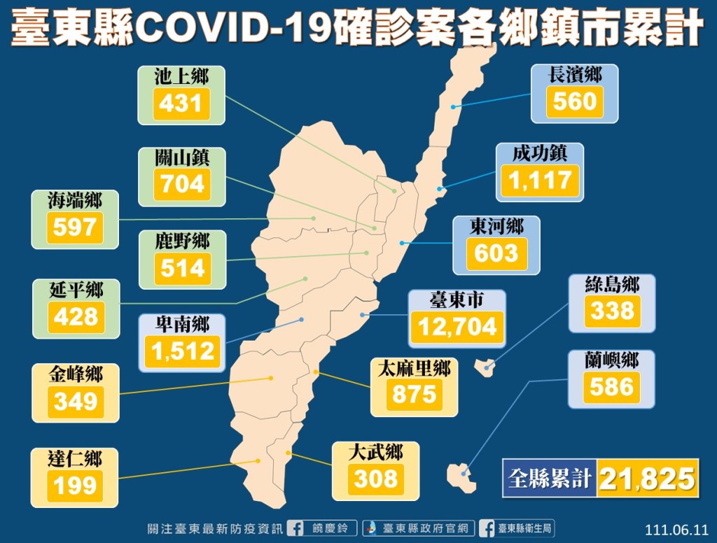台東縣今(11)日新增959名確診者,912名民眾戶籍或居住地分在台東、47名為外縣市醫院通報。目前台東縣累計確診個案21825人、居隔者1876人。目前台東針對Covid-19確診者分流收治情況,截至6/10下午16點為止,住院收治人數為55人、加強版集中檢疫所為47人、居家照護現管人數有3849人。