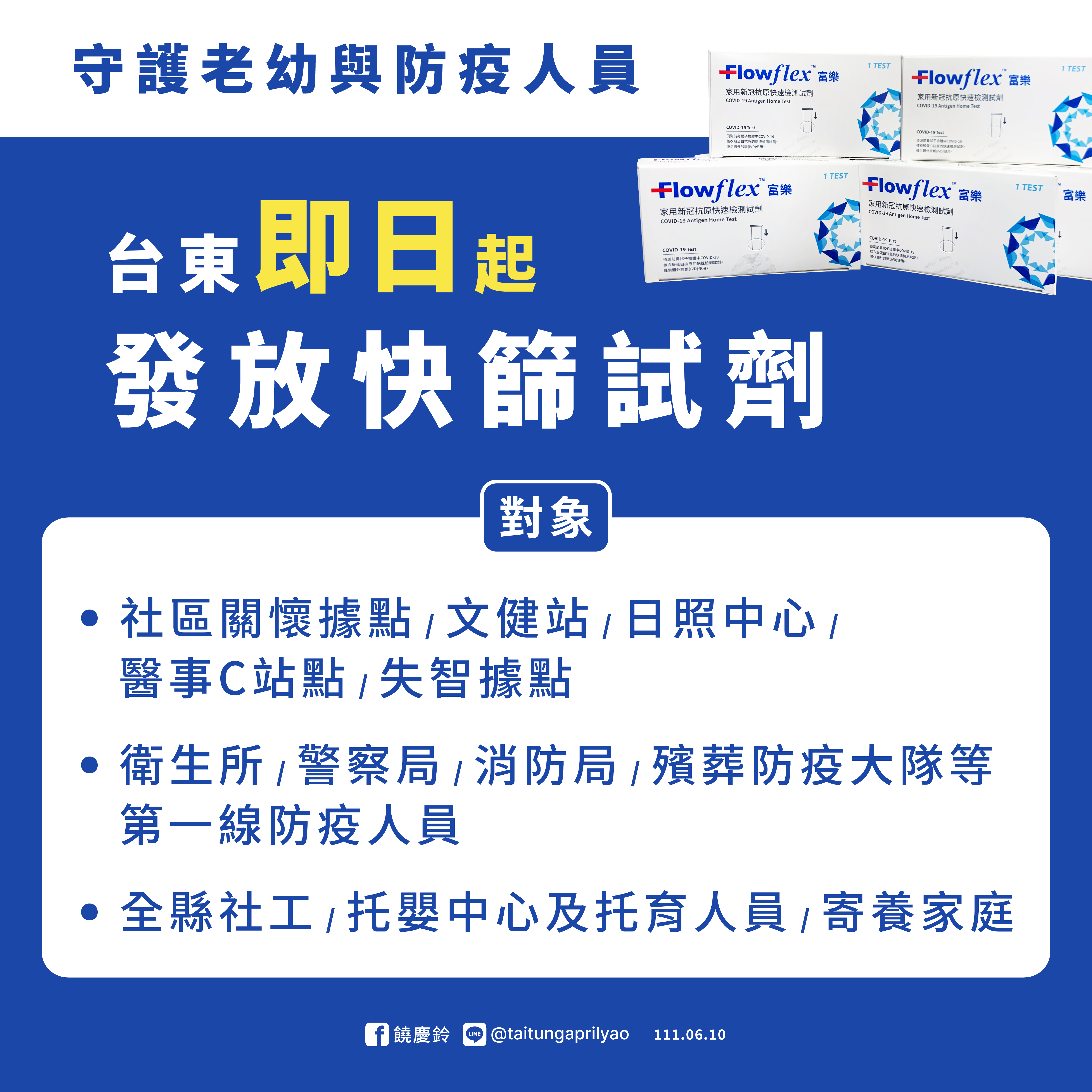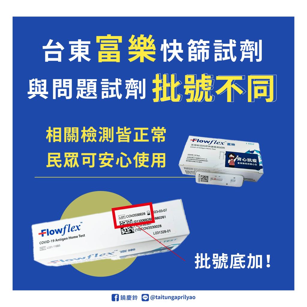 另有關昨(10)日台中市、高雄市購買美國富樂品牌快篩試劑批號「COV2025056」出現檢測結果異常狀況,臺東縣衛生局立即針對縣府購買同品牌(富樂)快篩試劑進行檢查,皆無「COV2025056」批號,且衛生局隨即進行試劑測試,檢測皆正常(試劑有呈現品管線-C線),民眾可安心使用。