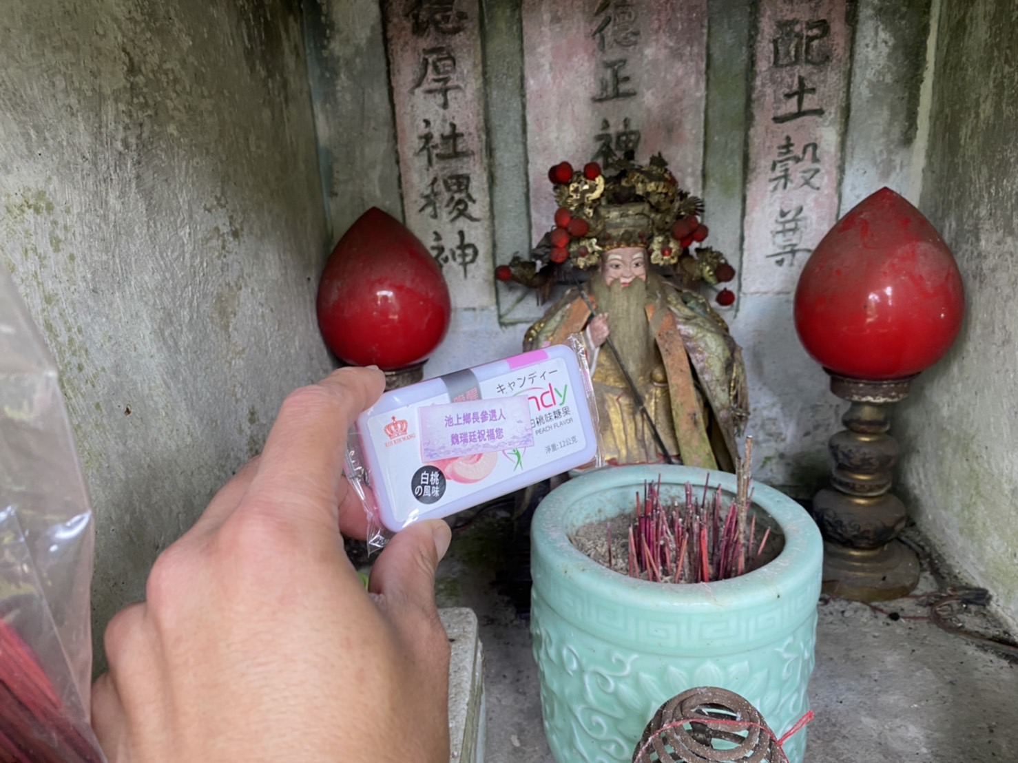 許多地方的初次拜訪,不只魏瑞廷自己訝異連住民亦都露出不可置信的表情,表示從來沒有人會走到這裡更遑論是來「拜票」。魏瑞廷指出,這些日子以來除了認識人連自己怕狗的陰影也意外克服,第一次拜訪狗會狂吠第二次以後竟然搖起尾巴,讓飼主自嘲連狗都被魏瑞廷接二連三的造訪因此熟絡起來。 這天,魏瑞廷的拜票行腳來到池上最北端的山區,路過座落在路旁一處迷你的「土地公廟」。可能是當地住民不多平日信眾少,所以小廟旁四週都長起雜草,連廟內土地公像前的香爐、酒杯供架等也顯得有些不潔,連香爐也積水未退。 魏瑞廷隨即點香先向土地公打聲招呼後,隨後挽袖開始打掃清潔;開玩笑今日「我們在乎您」的關懷對象主角是『獨居老人』土地公,在花費一番功夫整理還獻上糖果,魏瑞廷說「伯公」愛呷甜ㄟ,又替他打掃清潔居住的空間,應該能讓土地公「眉開眼笑」感受他都不是在說假的。