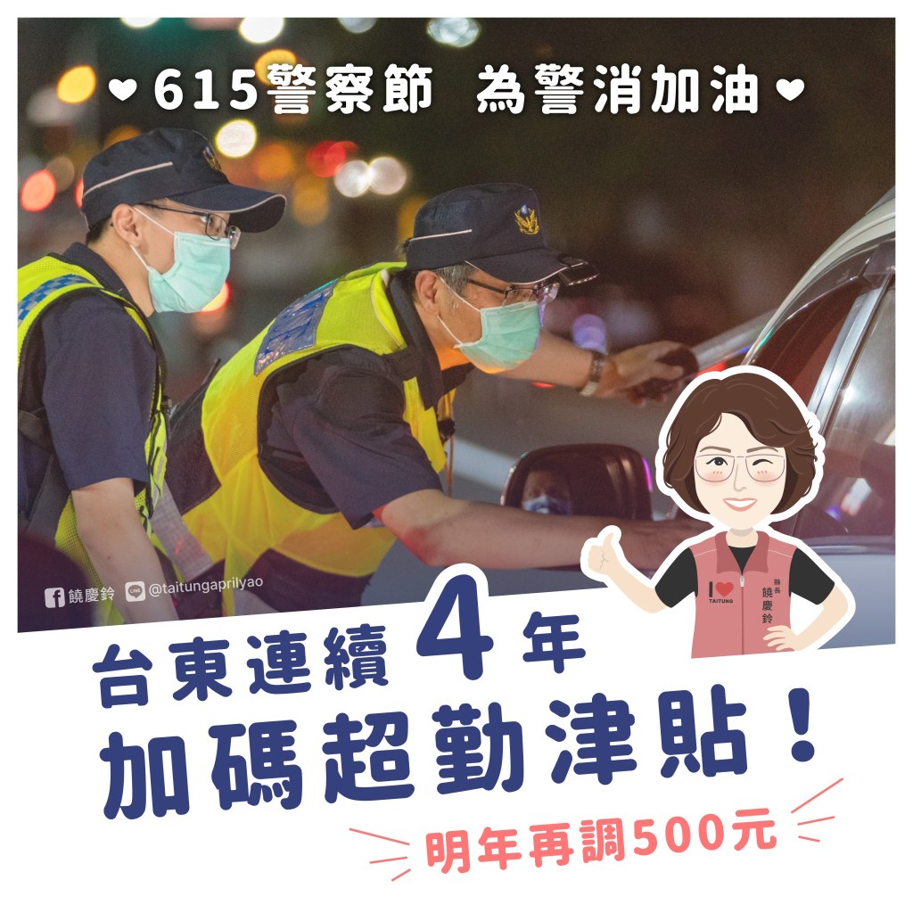 饒慶鈴表示,她一向重視警消同仁的福利,台東幅員大、警消人員人力有限,近年來又因為疫情關係,勤務更加繁重,各種情況都需要警消弟兄的協助,讓原本守護人民安全的艱重任務變得更加辛苦。所以在今天警察節特別宣布,明年度將再調高警消超勤津貼來為同仁加油打氣,是自上任後連續4年每年調升警消的超勤津貼,至今已達每月1萬3500元,明年再調超勤津貼500元到1萬4000元。並強調,在台東財政穩定且有餘裕的情況下,未來也會視財政狀況繼續這項措施。