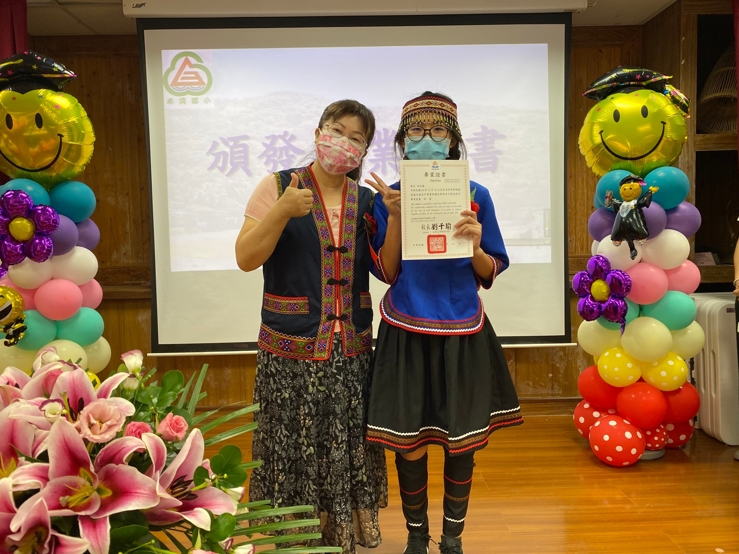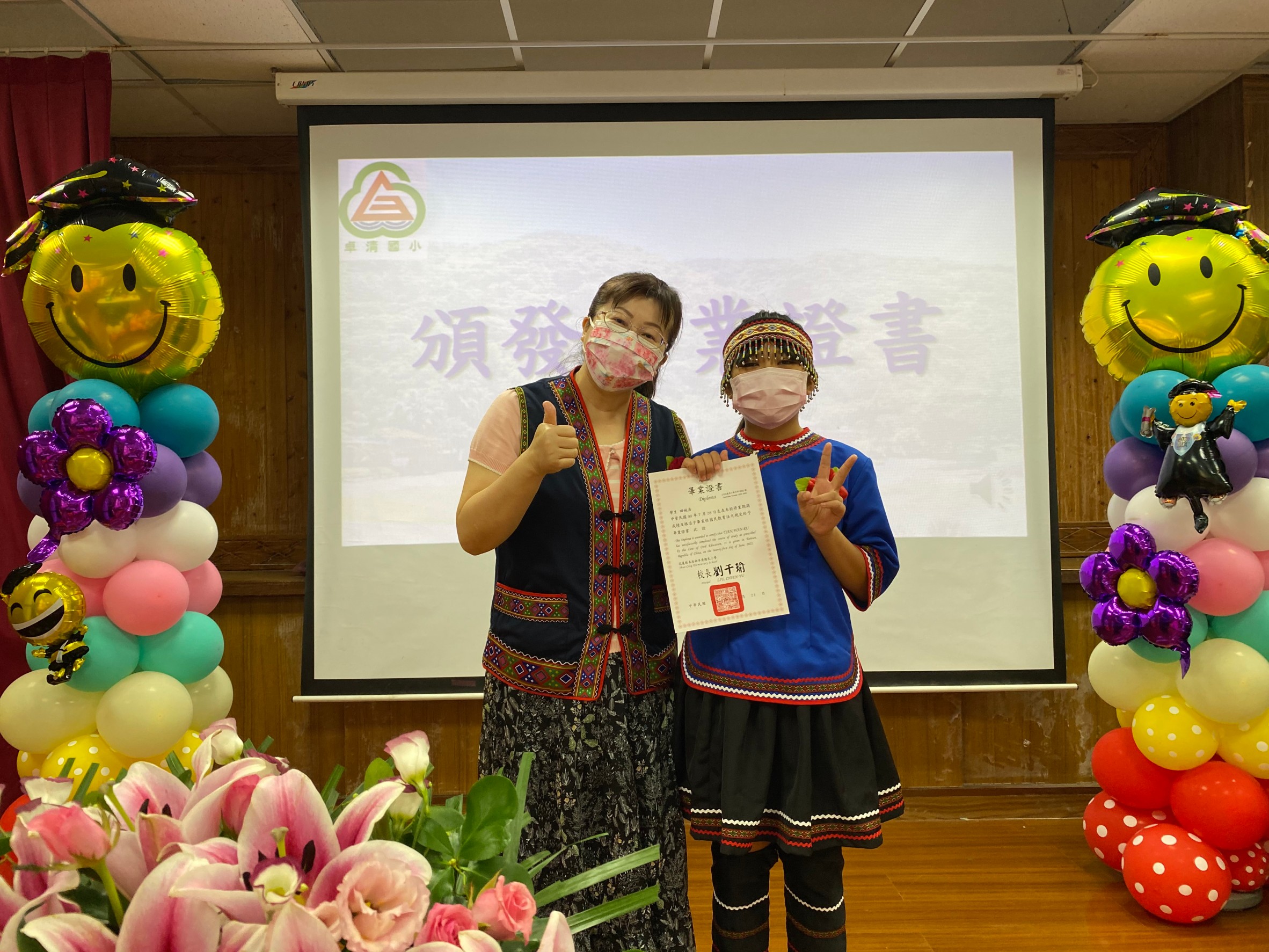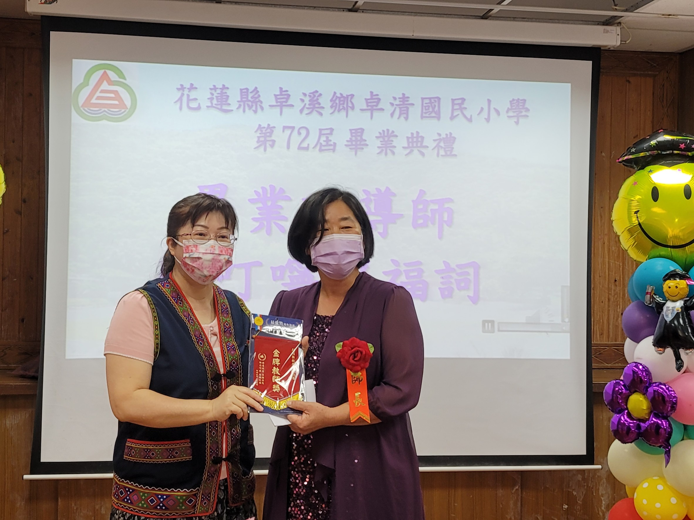 今年畢業班導師劉嘉佩老師108學年度自中城國小介聘至卓清國小即接任這班導師,整整3年的時間,嘉佩老師可說是像媽媽一樣的指導及關愛學生,所以劉千瑜校長特地頒發給畢業班導師一面【金牌教師】的錦旗,感謝她無私的付出。