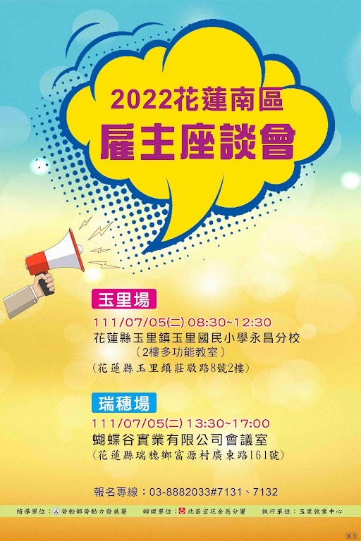 座談會報名專線及詳情請洽玉里就業中心:03-8882033轉分機7132陳先生,或上玉里就業中心資訊平台(https://sites.google.com/view/yuli-job/)線上報名。