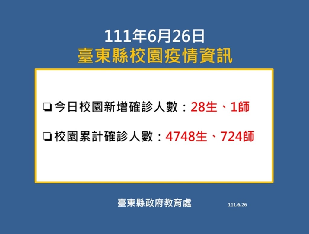 另外,暑假即將來臨,台東縣內高中以下學校自7/1起,有條件開放暑期營隊及交流活動,慶鈴縣長並請民眾務必遵守相關規範:暑假學習或活動,在落實防疫措施並徵得家長同意下,得實體辦理縣內外交流及跨校活動,暑期營隊人員入校需完成三劑疫苗接種。無接種三劑疫苗者,需於營隊前一天提供快篩陰性證明,兒童COVID-19疫苗接種,請依學校安排入校集中施打,目前仍不開放遊客進入校園參訪。