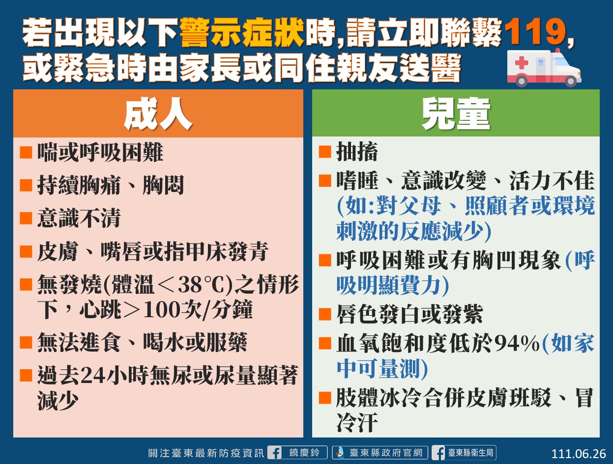 台東縣衛生局提醒如家中兒童確診請密切觀察是否出現:抽搐、意識不佳、呼吸困難或有胸凹現象、唇色發白或發紫、如家中有血氧機,血氧飽和度低於94%、肢體冰冷且有皮膚斑駁或冒冷汗症狀,如有以上症狀請家長(同住親友)或撥打119送至縣內設置兒科醫院(台東基督教醫院、台東馬偕醫院).