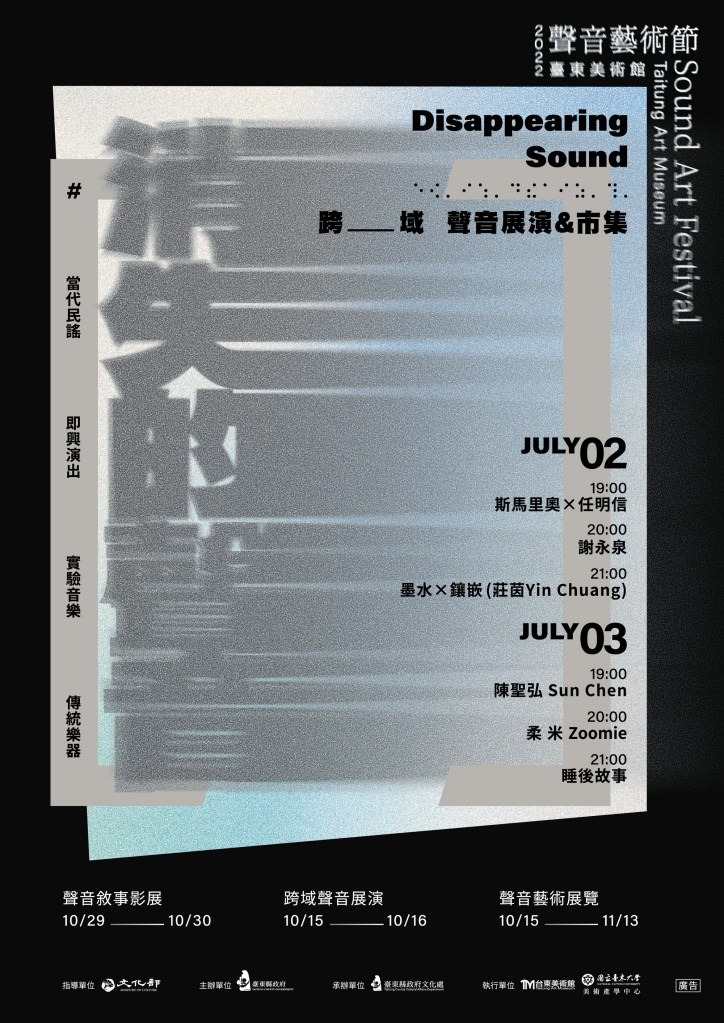 除了7月的跨域聲音展演外,文化處也訂於10月15、16日安排另一場次,更將有全新的卡司與嘗試;10月15日起搭配「消失的聲音」主題,規劃聲音藝術展覽,邀請6組不同聲音媒材與介質的作品來到臺東美術館展出;今年也再次與大大樹音樂圖像聯合策劃的聲音敘事影展,思考該如何探索與看待在當代社會被埋藏的歷史,將在10月29、30日於臺東美術館小文創教室播映。從盛夏到初秋,讓我們一起捕捉這些稍縱即逝的、消失的聲音,更多相關活動資訊以臺東美術館聲音藝術節粉絲專頁(https://www.facebook.com/SoundartTaitung)公告為主。