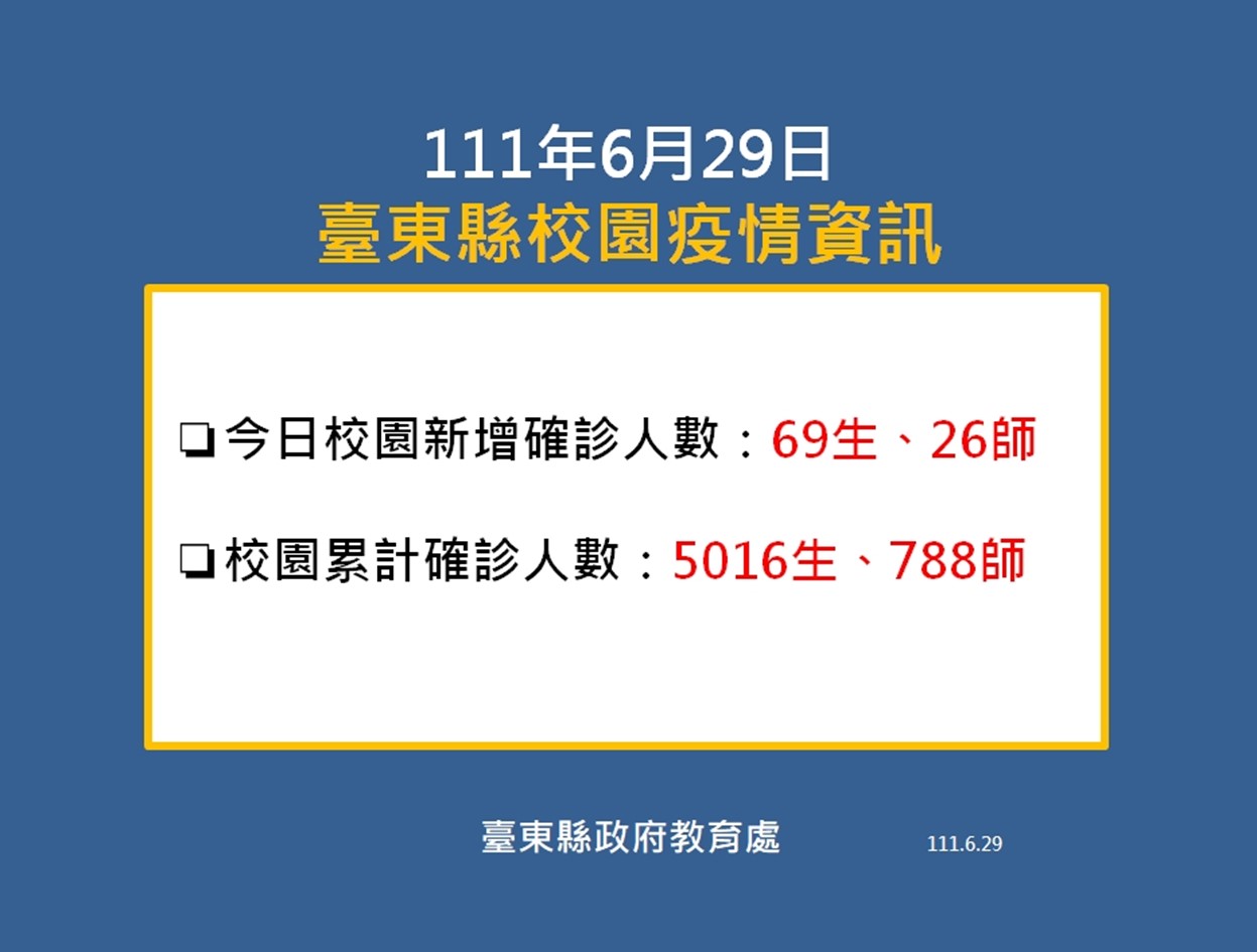 另外,中央今日也公布台東有2例本土病例確診死亡個案,第一案為44歲男性,已接種2劑疫苗;有中風、肝腎疾病及氣喘;第二案78歲男性,已接種3劑疫苗;仍調查中。在校園疫情部分,台東縣今日則新增確診69生、26師,累計共5016生、788師。