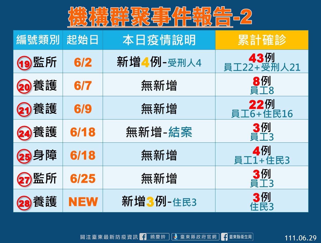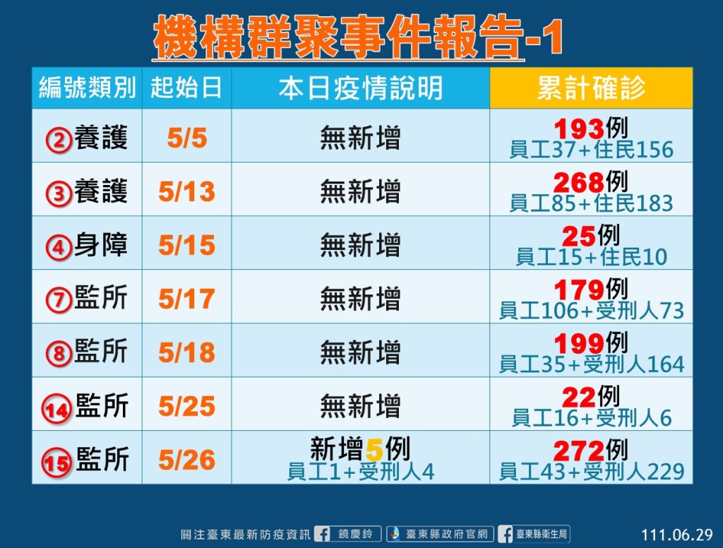 台東縣衛生局表示,今日1養護機構監測期滿結案,但又新增1養護機構群聚;統計縣內目前共有5養護、6監所、2身障群聚事件監控中,今日共新增12例確診個案。養護機構部分,新增3住民確診;監所新增9人(1員工、8住民);身障機構無新增。群聚監測中機構仍將暫停探訪探視避免擴大,衛生局將持續安排定期採檢匡列,並協助機構落實感染管制措施。