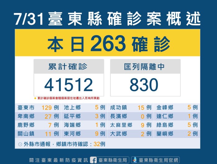 城鄉新聞 記者 姜嘉瑋/臺東報導 台東縣今(31)日新增263位確診者,231名民眾戶籍或居住地分在台東、32 … 繼續閱讀 台東縣今增263確診 各鄉鎮衛生所加開幼兒莫德納疫苗接種 請盡快陪同幼兒完成接種