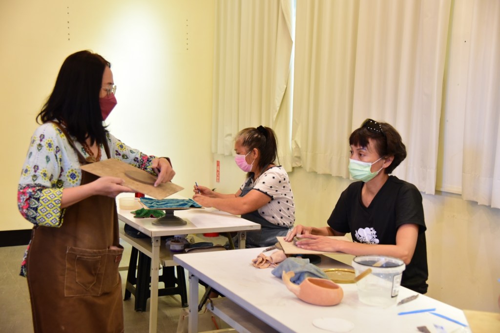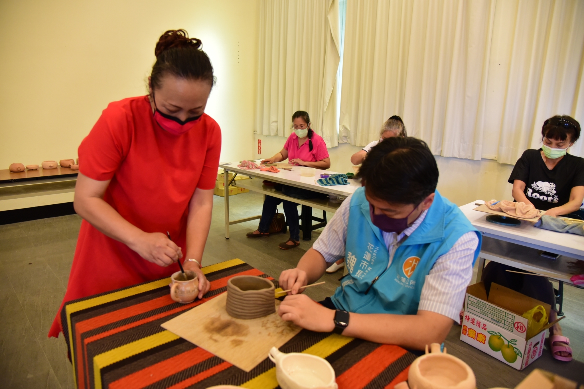 魏嘉賢市長今(3)日前往花蓮市原住民文化歷史館關切學員上課情形,陶福入研習課程邀請梁淑琴及林香蘭老師指導,原本是在三月開課,未料適逢疫情延燒,因此延至六月復課。課程內容包括基本捏塑技巧練習、泥條盤築成型法,以及刻紋與圖騰的技法。老師示範教學山豬造型的方法,同時讓學員嘗試製作,部分成品經過燒製後,今天均已送到課堂上,梁老師和學員們討論作品應改善之處以及捏製的竅門。