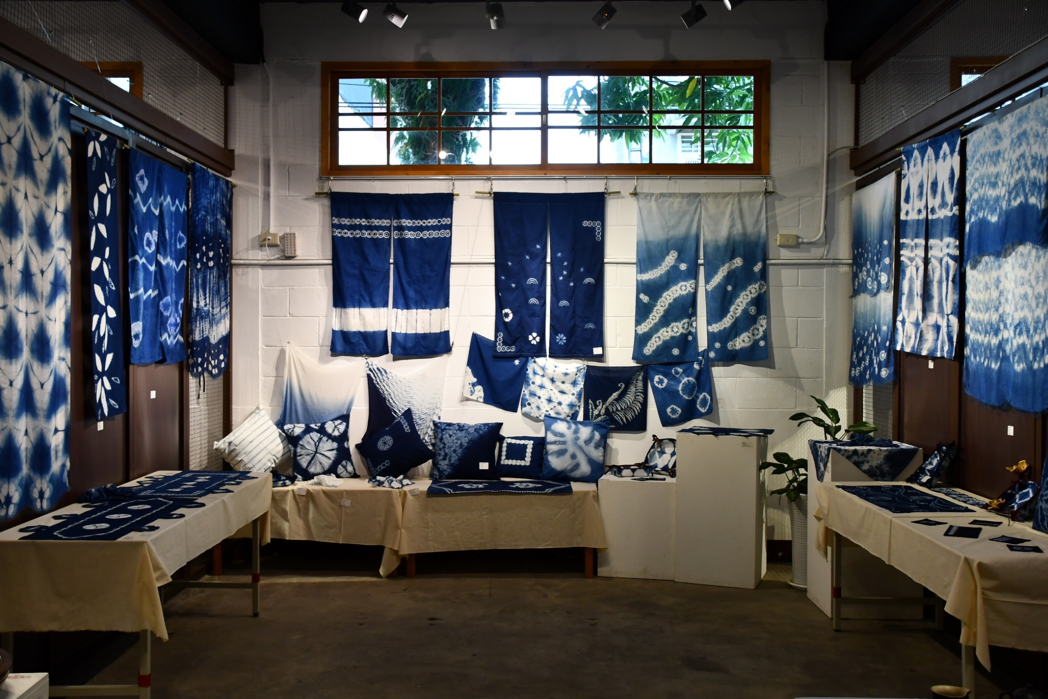 透過一針一線、層層疊疊的紮縫技法,學員們在布面上展開與藍染色彩的對話,表現藍染創作變化萬千的色澤與樣式,並結合生活文創布品,將獨樹一幟的藍染風格融入日常,現場也同時展出「花葉移印染」特殊技法作品,讓自然花草樹葉的紋路肌理與布面交織呈現。游淑貞表示,每一件手工藝作品都有其獨特創意元素,而唯有全心的投入創作才能展現如此動人的成果。