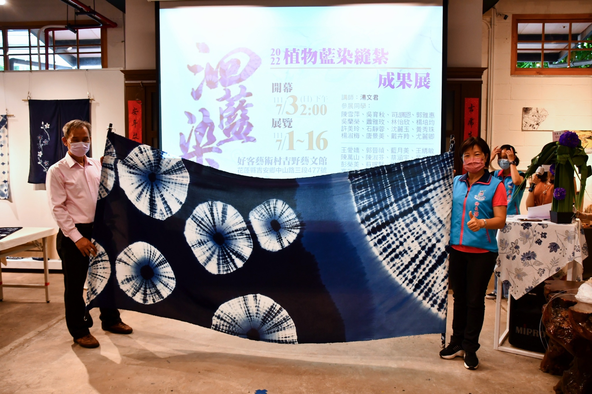 「2022洄藍染-植物藍染縫紮」成果展開幕儀式與會貴賓有行政院東部聯合服務中心副執行長郭應義、花蓮縣政府北區服務中心副主任邱增良、花蓮市公所秘書蔡淑香、東華大學教授萬煜瑤、東海岸文教基金會監察人江躍辰醫師、鍾華玉品藝術工坊工藝師鍾榮華、樂分享快樂樂團團長羅進福、多位學員以及地方仕紳。展期即日起至16日止,每周二至周日上午9點至下午4點開放免費參觀,邀請鄉親踴躍到場觀賞藍染工藝之美。