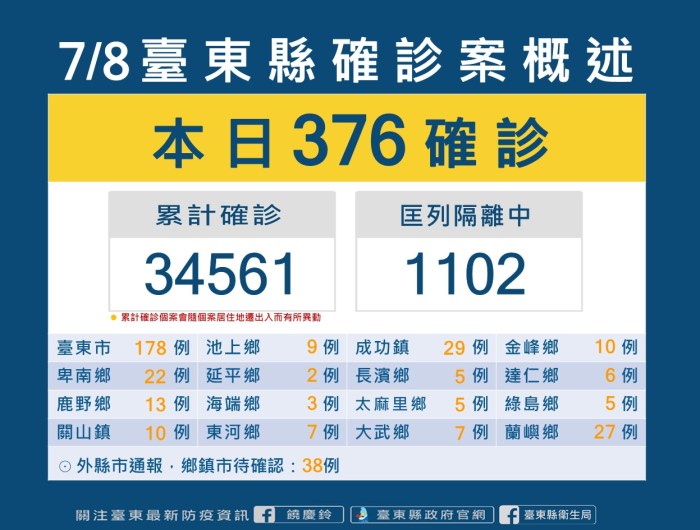 記者 姜嘉瑋/臺東報導 台東縣今(8)日新增376位確診者,338名民眾戶籍或居住地分在台東、38名為外縣市醫 … 繼續閱讀 台東今日新增376 饒慶鈴呼籲65歲長者及相關行業人員盡速施打第4劑 民眾落實防疫措施