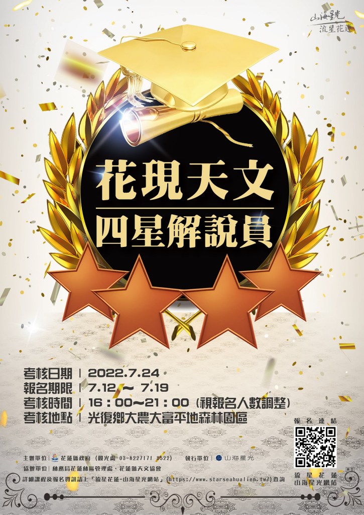 四星級天文解說員認證報名時間為7月12日早上10時至7月19日,具報考資格的解說員欲知詳細報考資訊與制度,請見「流星花蓮-山海星光」網站(https://www.starseahualien.tw/)。