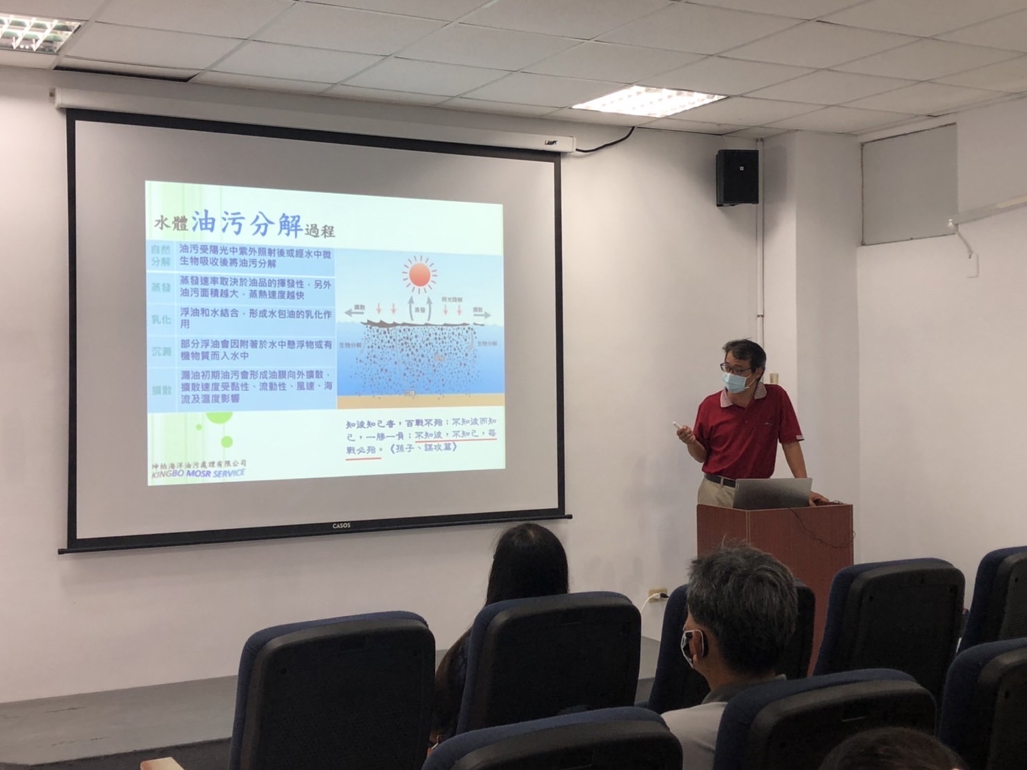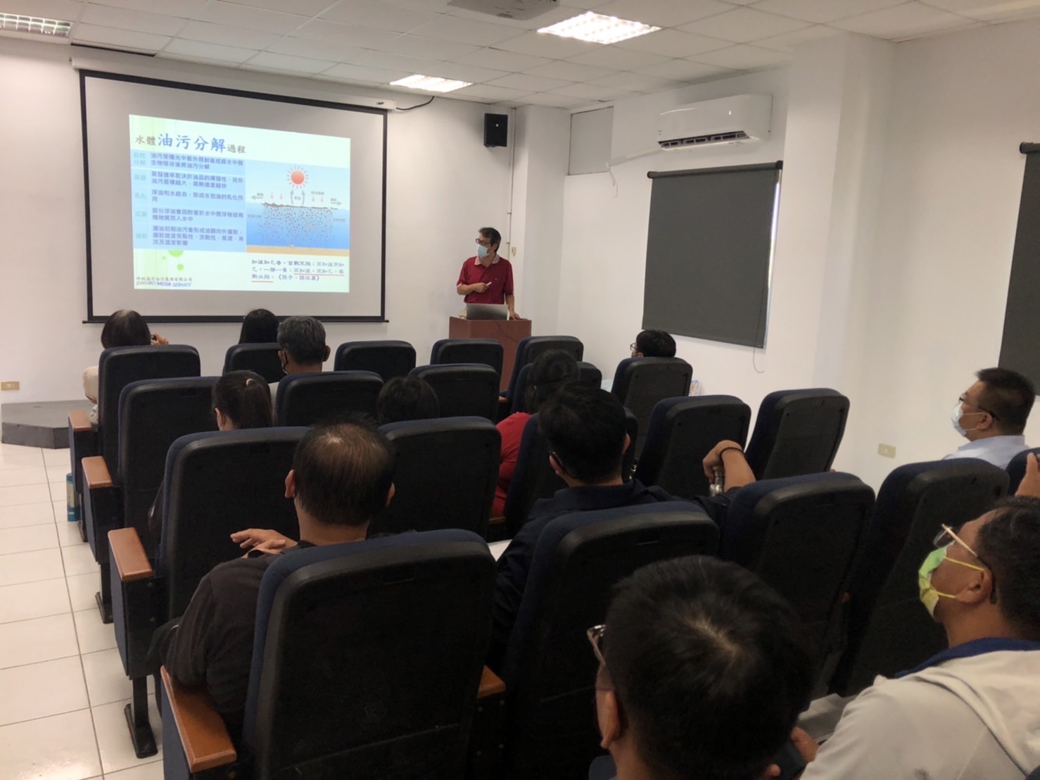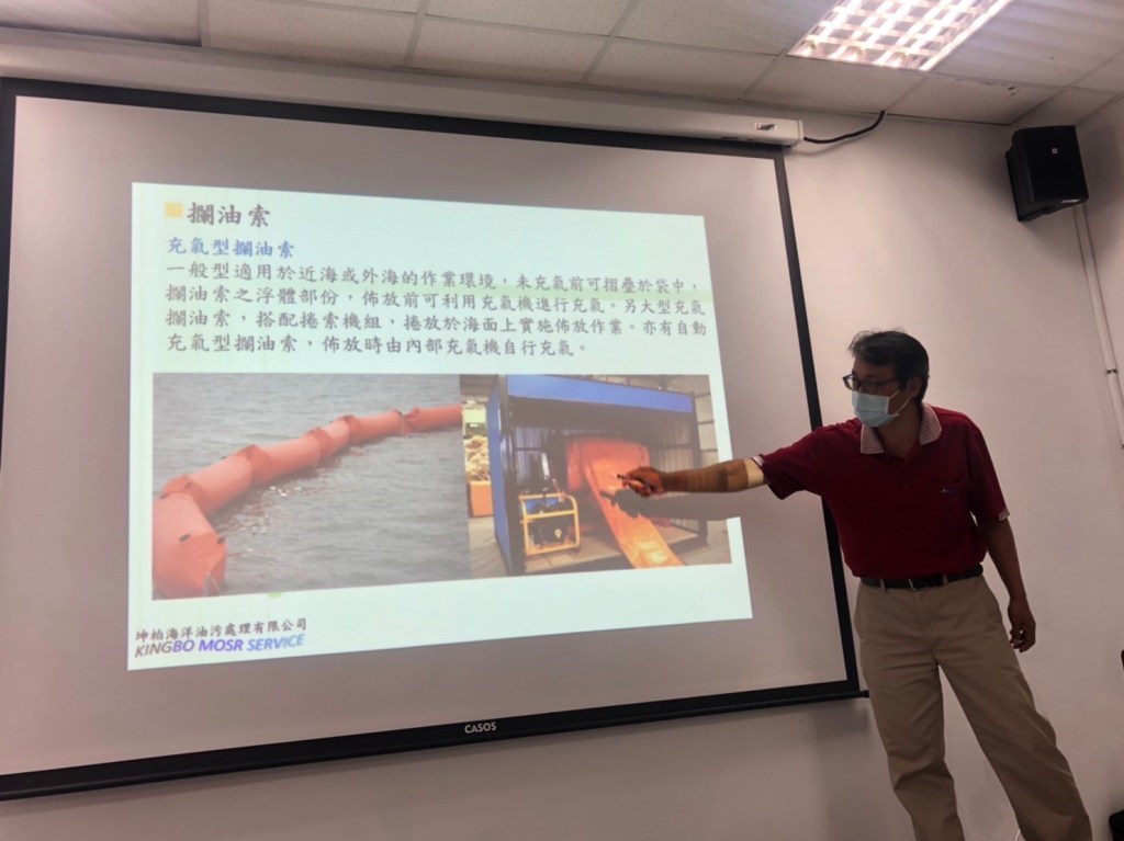 環保局指出,海洋污染應變教育訓練主要課程包括各類油品污染特性、環境因素對於油污染的影響以及相關案例的處理流程,緊急應變設備器材訓練,是以器材原理介紹、使用方法、平日維護保養要點、現場實地操作教學等,更深入了解海洋油污染的應變措施,減緩海洋油污染發生對生態的危害。