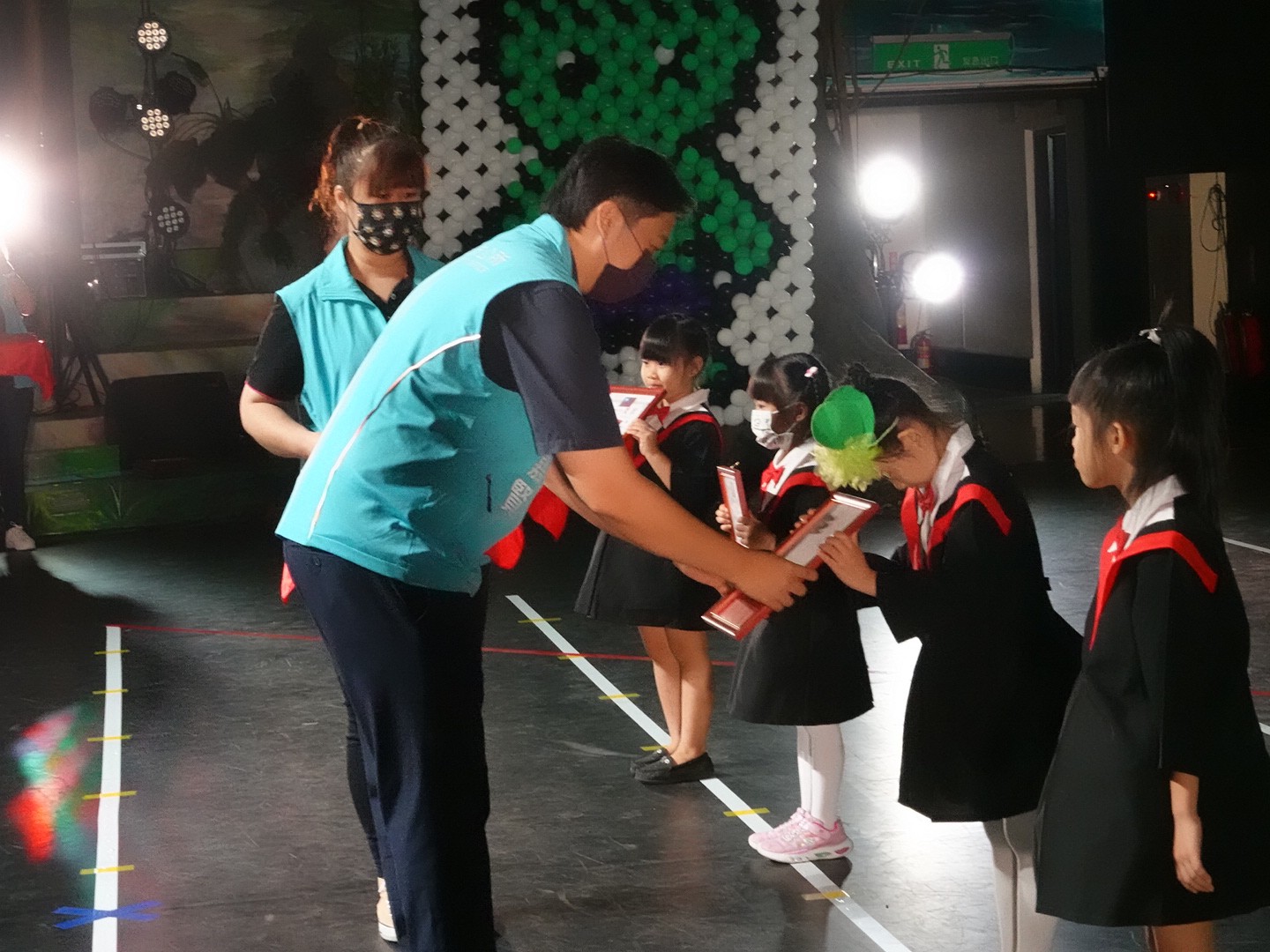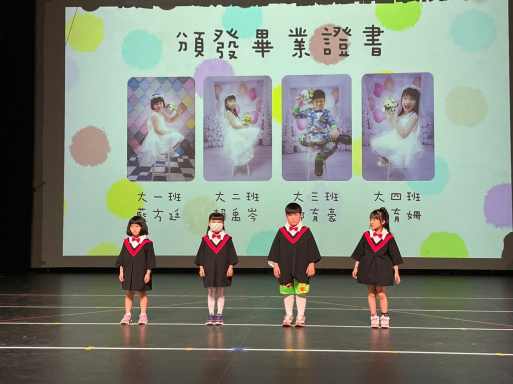 小朋友在劇中分別扮演成老師、家長、同學,並換上不同服裝,來呈現節奏感、律動、體能活動等,每一場音樂、舞蹈都是老師們精心設計,小朋友活潑可愛的演出萌翻全場,更讓家長們卯足了勁拍照,只為記下孩子們歡樂的寶貴時刻。 典禮中魏嘉賢市長發給畢業生每人一個書包、家長委員會送給每一位孩子圖書禮券,另外也分別頒奬表揚獲得縣長獎、議長獎、市長獎及主席獎的小朋友。魏市長及貴賓們與小朋友一起唱出畢業歌《勇敢的長大》,為活動畫下句點,也期望小小幼苗在日後的人生歷程裡都能快快樂樂的學習、平平安安的長大。