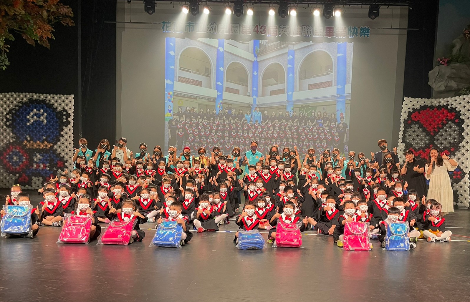 花蓮市立幼兒園第43屆畢業典禮,今天在台灣原住民族文化館熱情登場,孩子們結合網路劇與現場表演的方式,呈現在幼兒園三年的精彩回憶,並從市長魏嘉賢的手中拿到人生的第一張畢業證書。市長爸爸也恭喜畢業生完成人生第一階段學習成果,也勉勵小朋友勇敢迎接下一個成長的挑戰。 典禮一開始,由畢業生帶來熱情的演出為活動揭開序幕,緊接著每班畢業生依序走向舞台,並由各班級老師帶著小朋友向所有人一鞠躬說「謝謝大家」,表達感恩之意,場面十分溫馨。