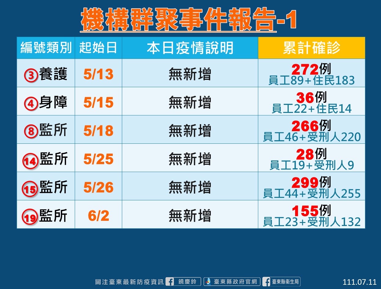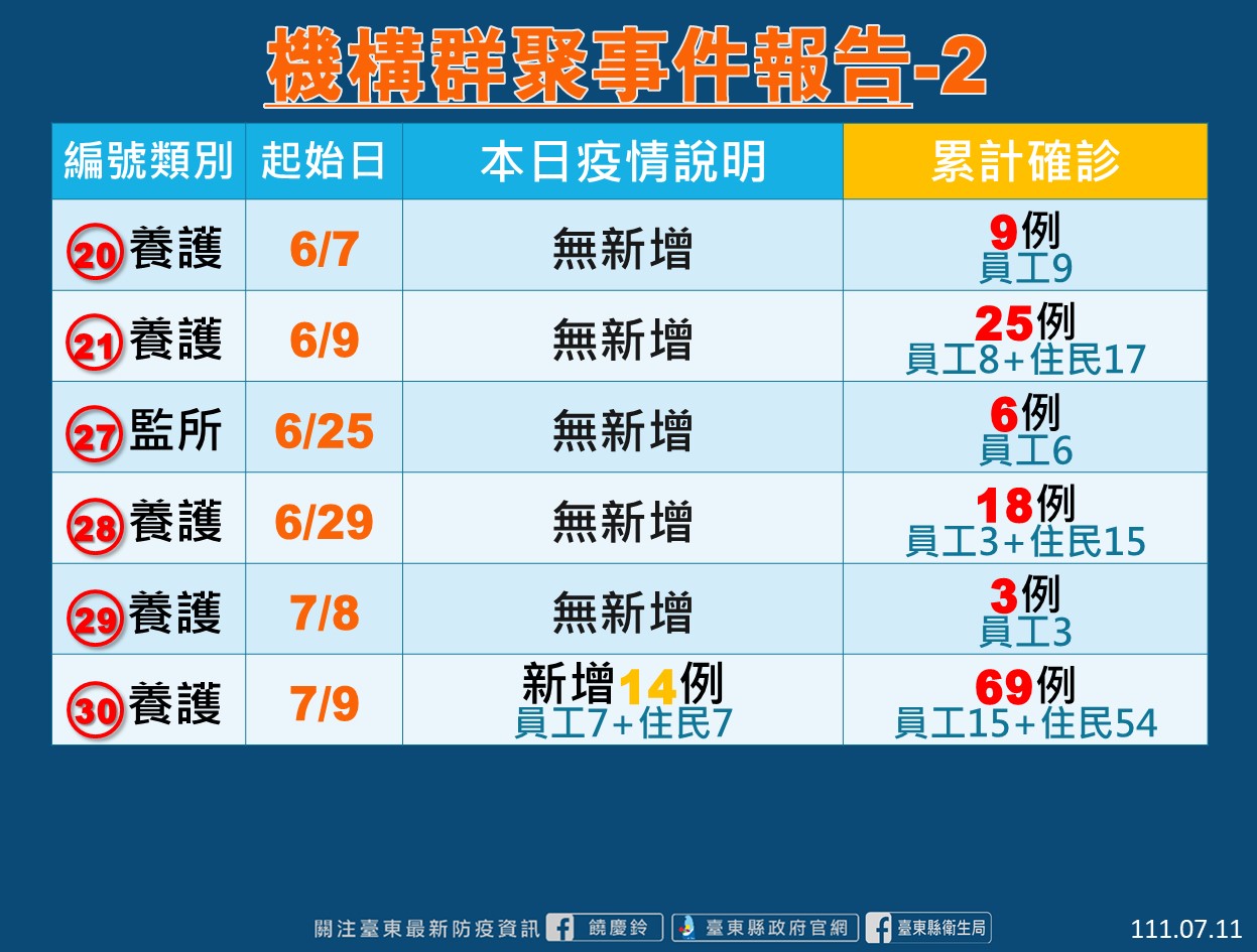 台東縣衛生局表示,縣內目前共有6養護、5監所、1身障機構群聚事件監控中,今日共新增14例確診個案,皆為養護機構(7員工、7住民),其餘類別機構今日無新增。衛生局將持續安排定期採檢匡列,並協助機構落實感染管制措施。