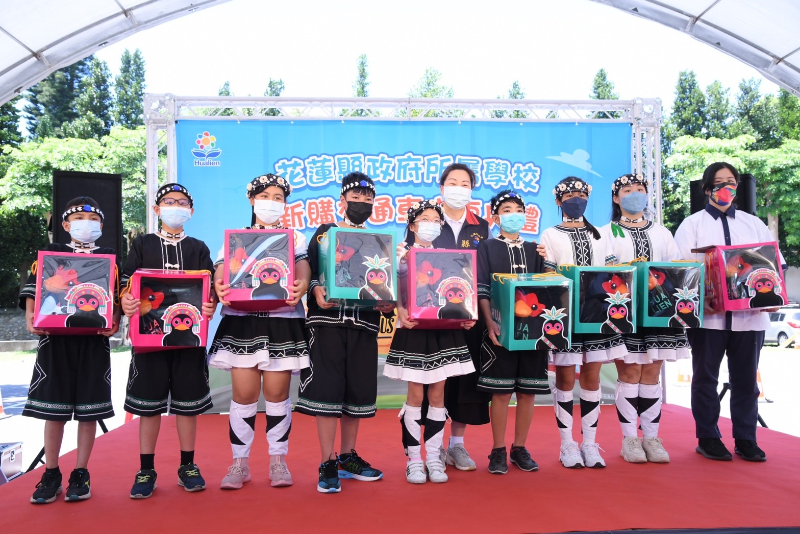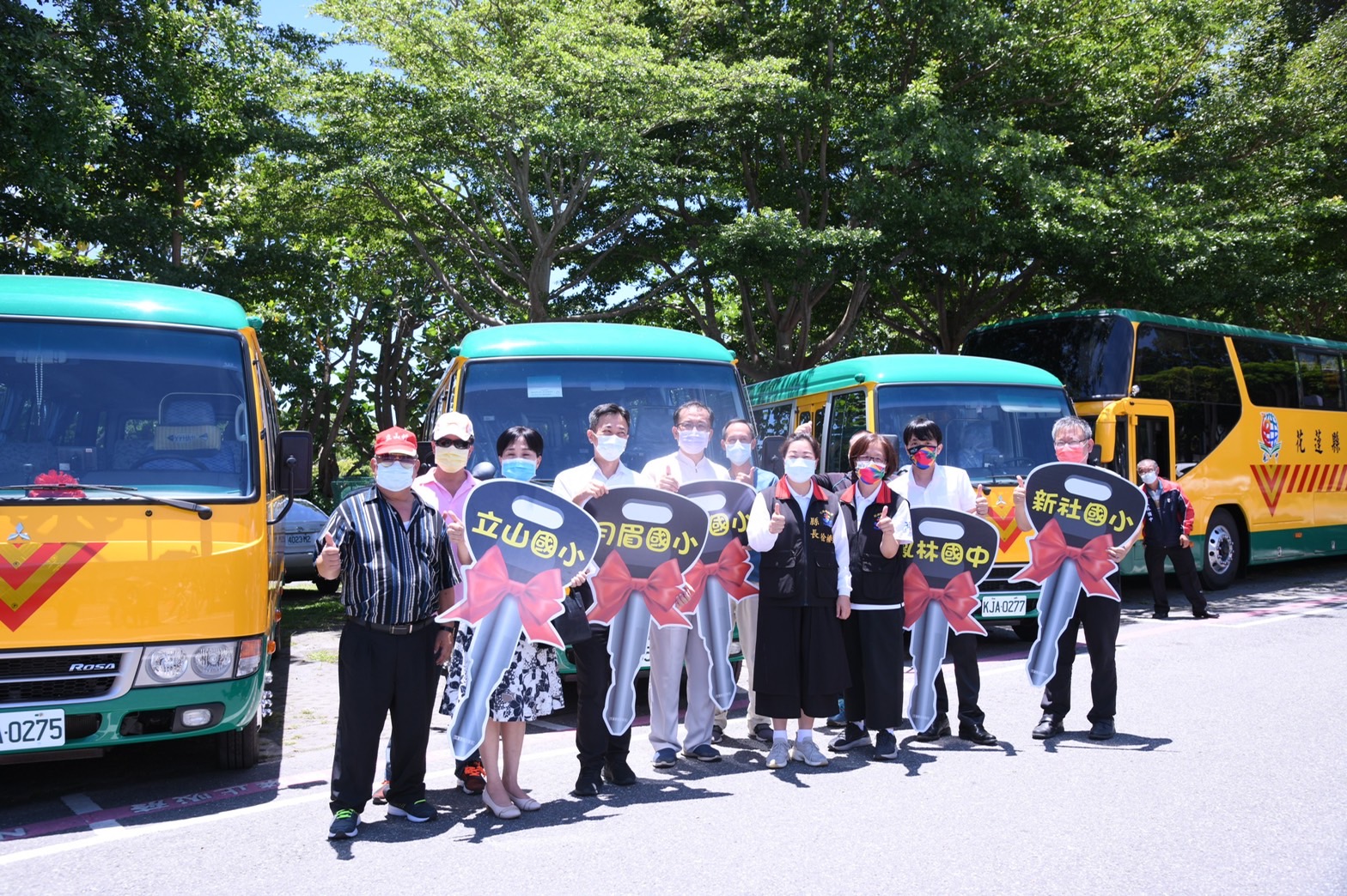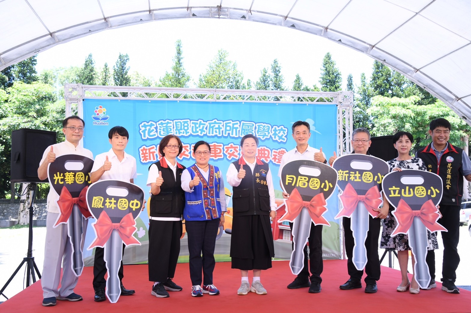 花蓮縣南北狹長,造成部分偏遠地區學生就學不易,家長深為接送學生上下學的壓力困擾,為減輕家長的負擔,同時考量載運學生上下學之安全,經花蓮縣政府教育處積極向教育部爭取專款補助,汰換已屆法定使用年限之交通車,日前獲教育部核定補助經費近新台幣1,655萬元,受補助學校包括鳳林國中、光華國小、月眉國小、新社國小及立山國小等5校共5輛交通車,今(12)日在花蓮縣政府南側廣場辦理交車典禮。